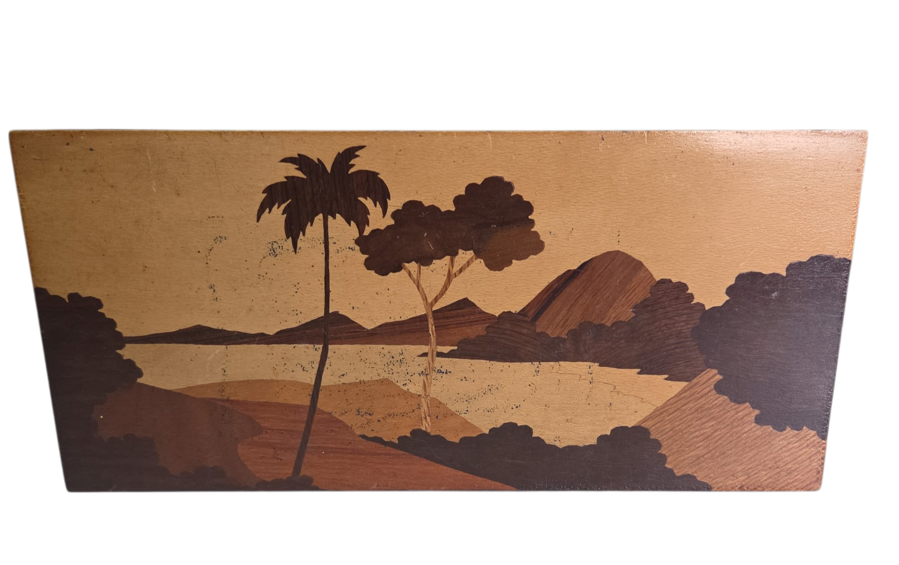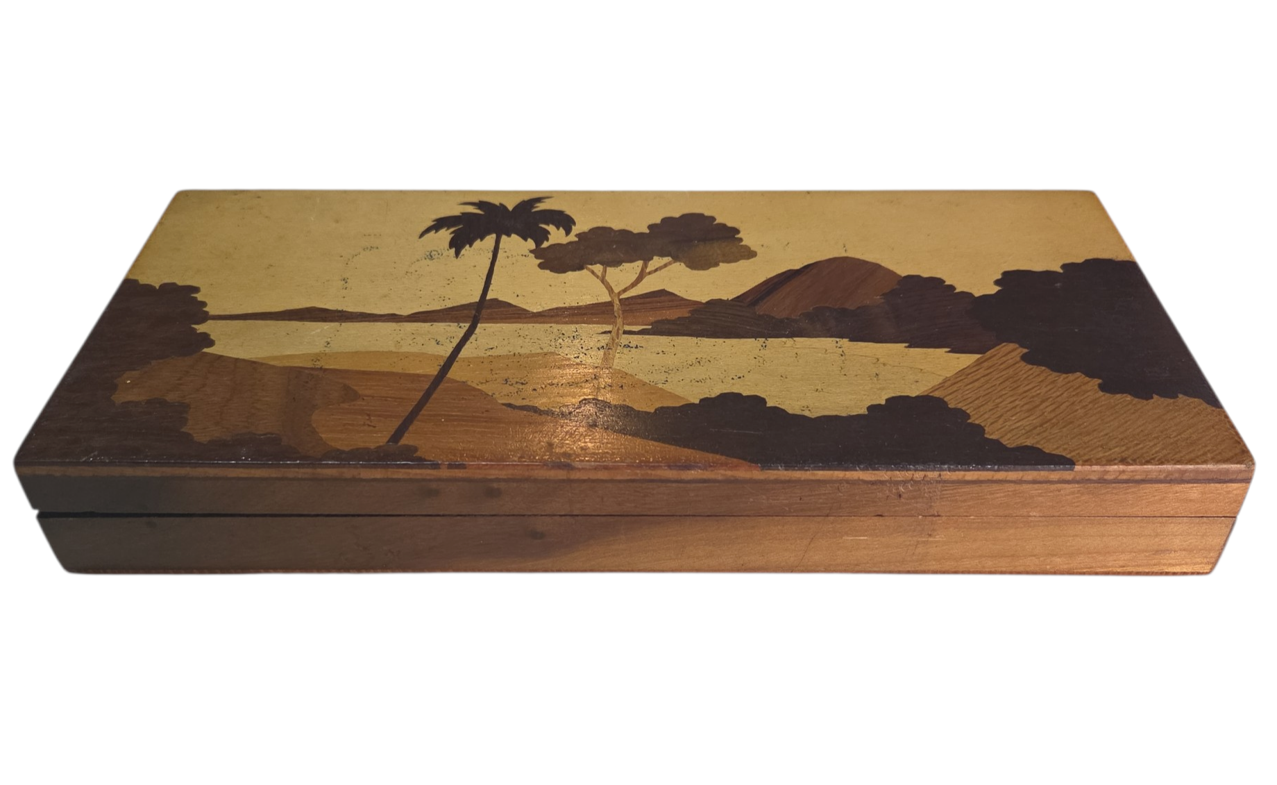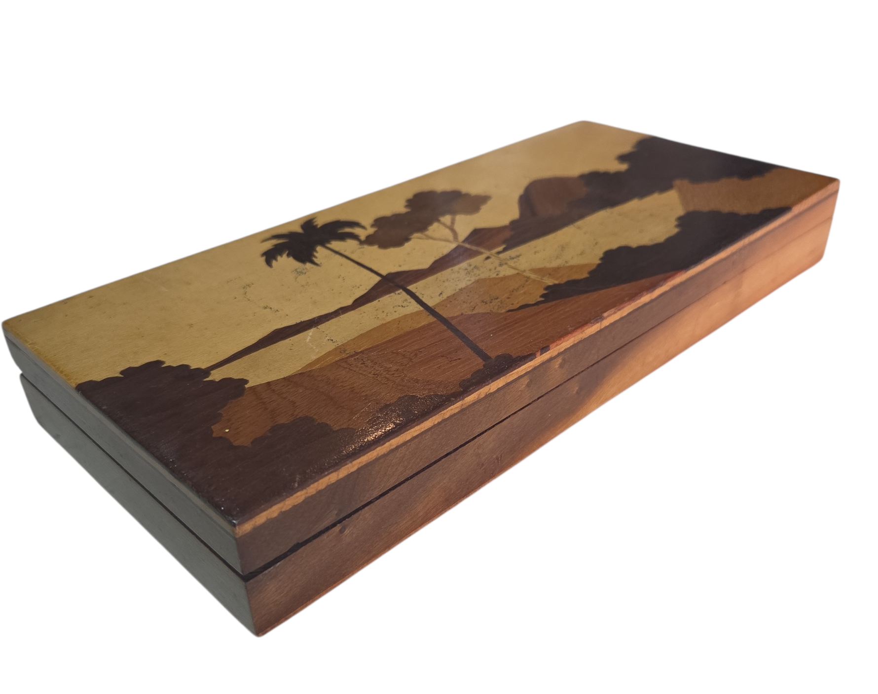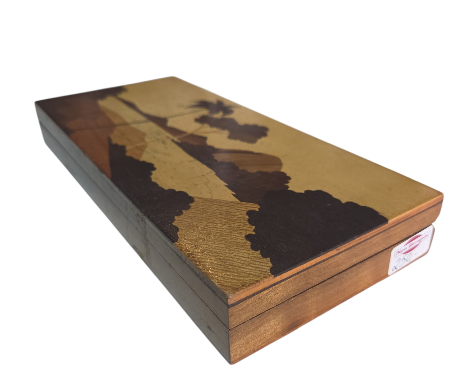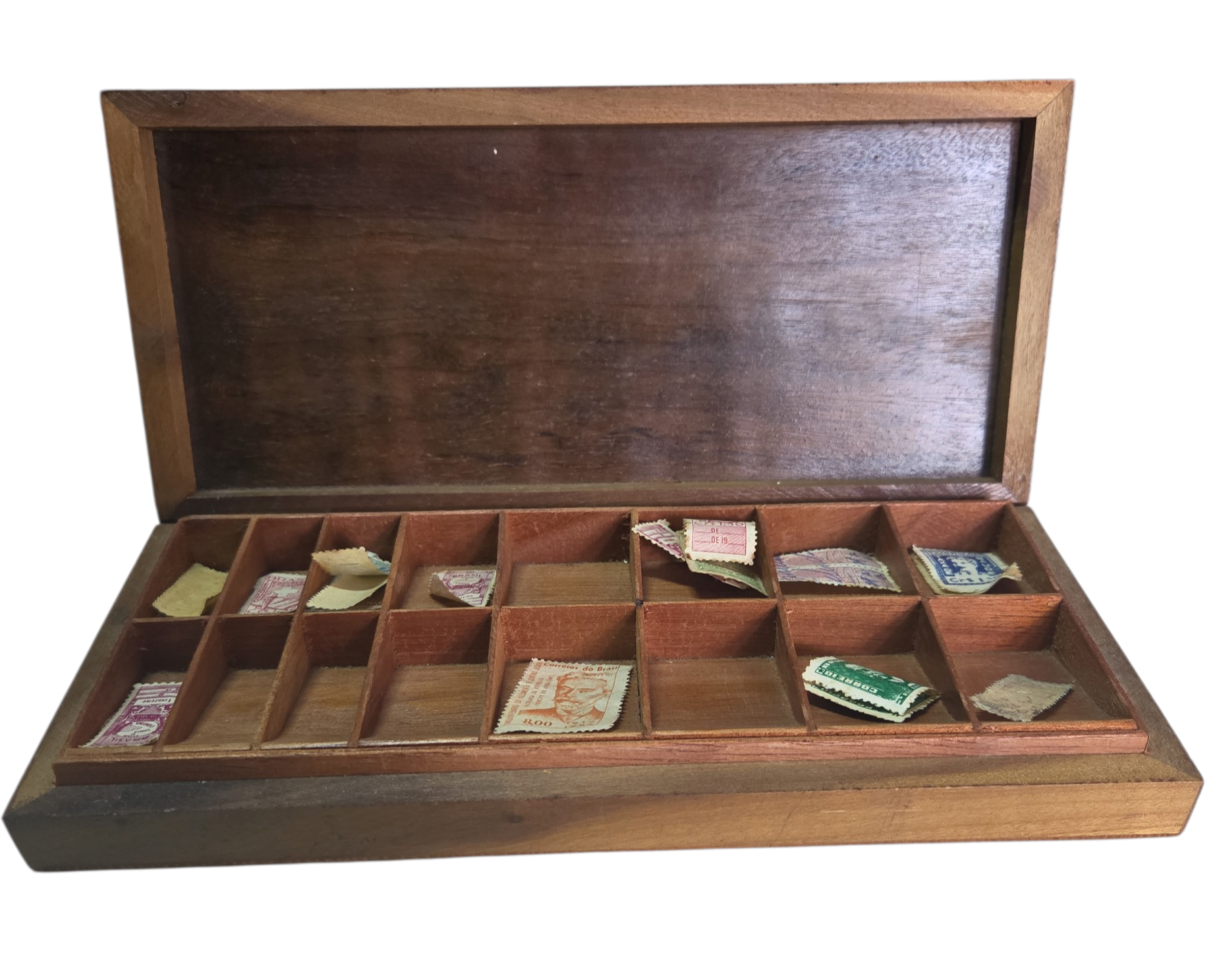 Uma peça de requinte para os amantes da filatelia e da marcenaria clássica. Este porta-selos apresenta um minucioso trabalho de marchetaria na tampa, utilizando diferentes tons de madeira para criar um padrão geométrico exclusivo. O interior é projetado para organizar selos com segurança, protegendo-os da humidade e da luz. Uma peça de colecionador que alia funcionalidade a uma estética impecável.