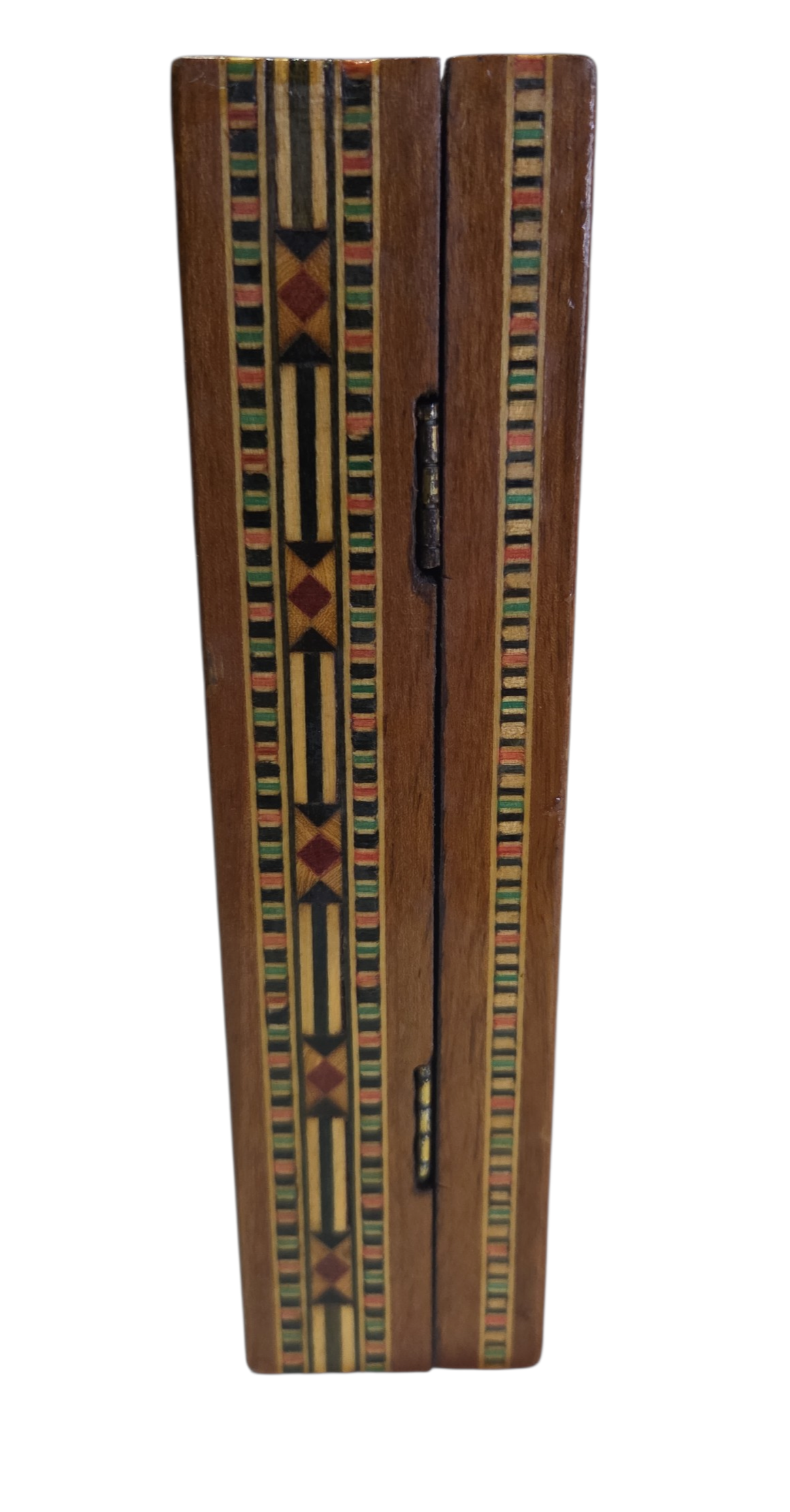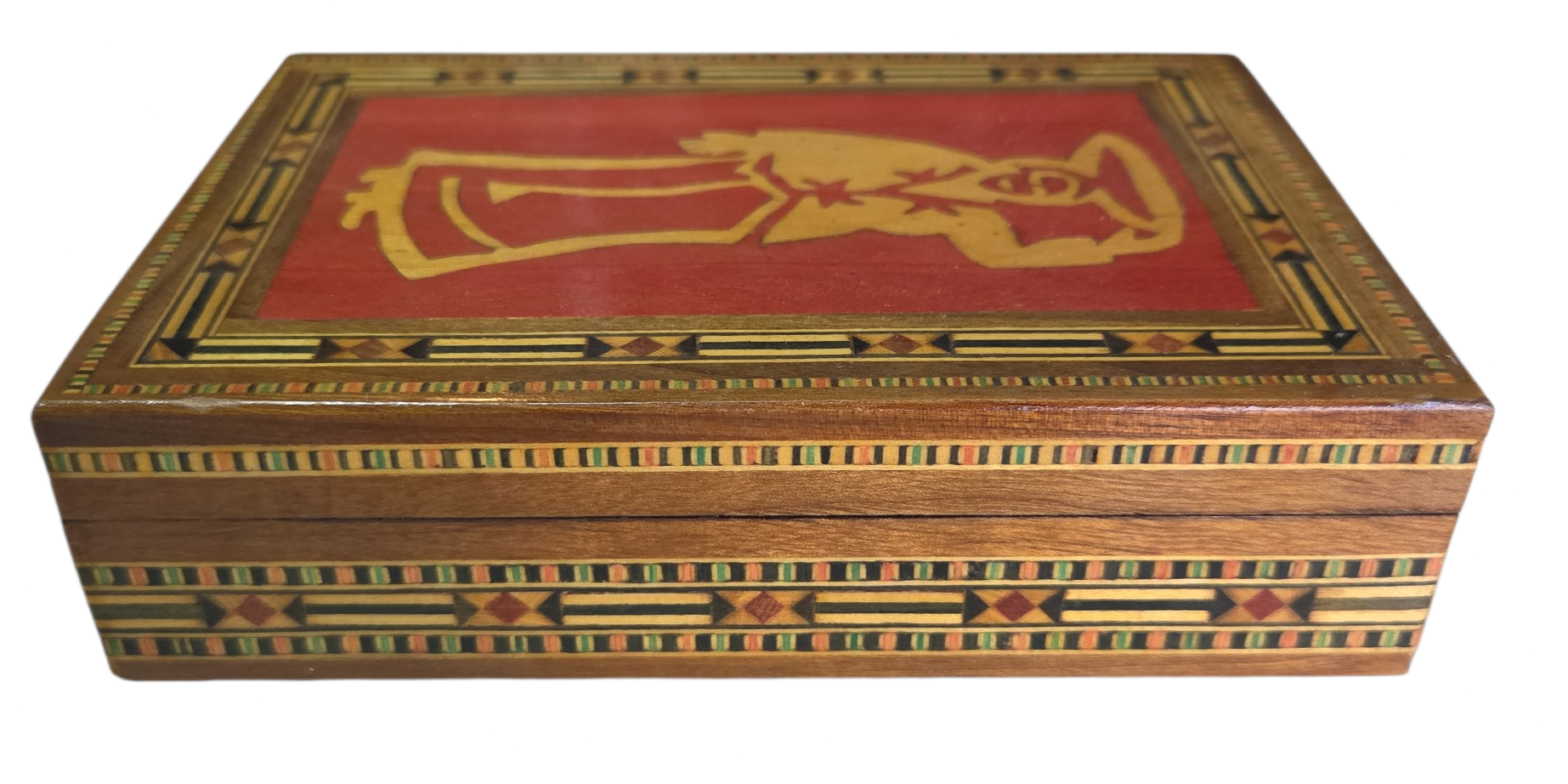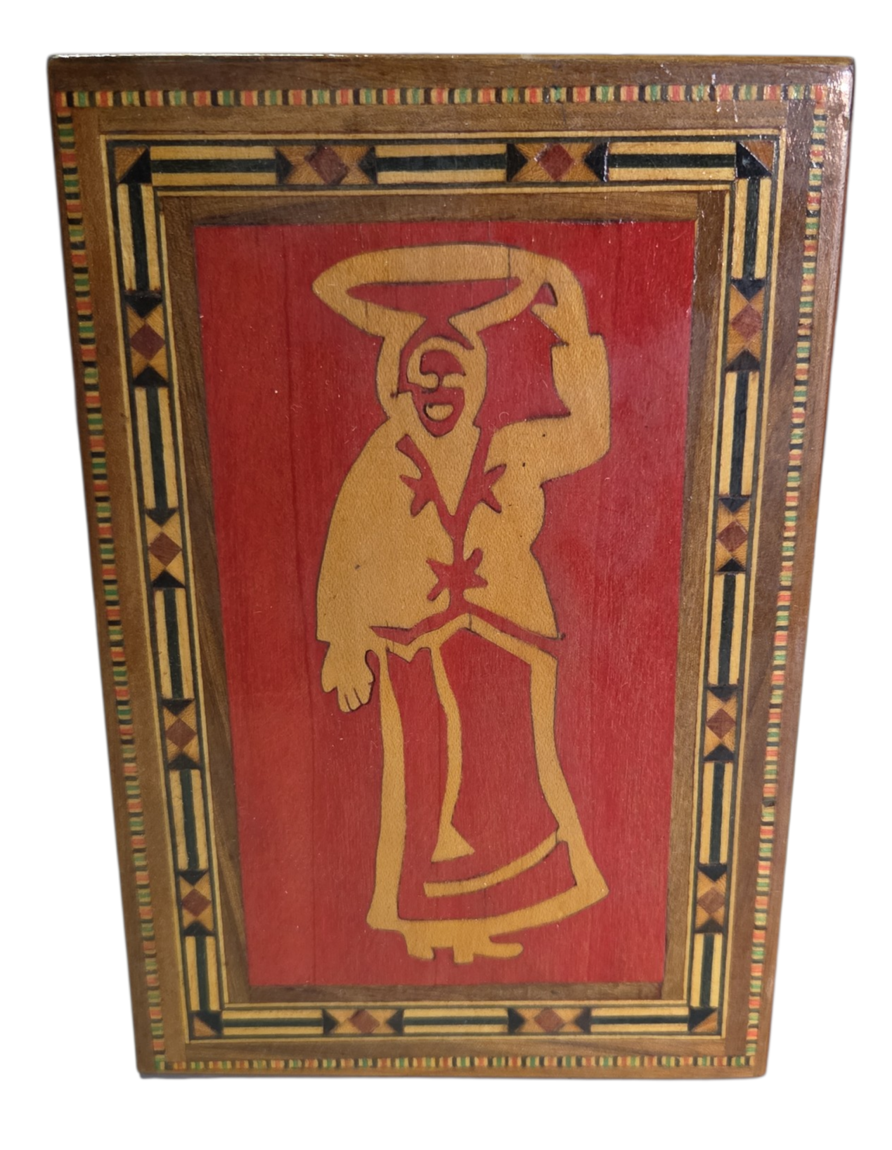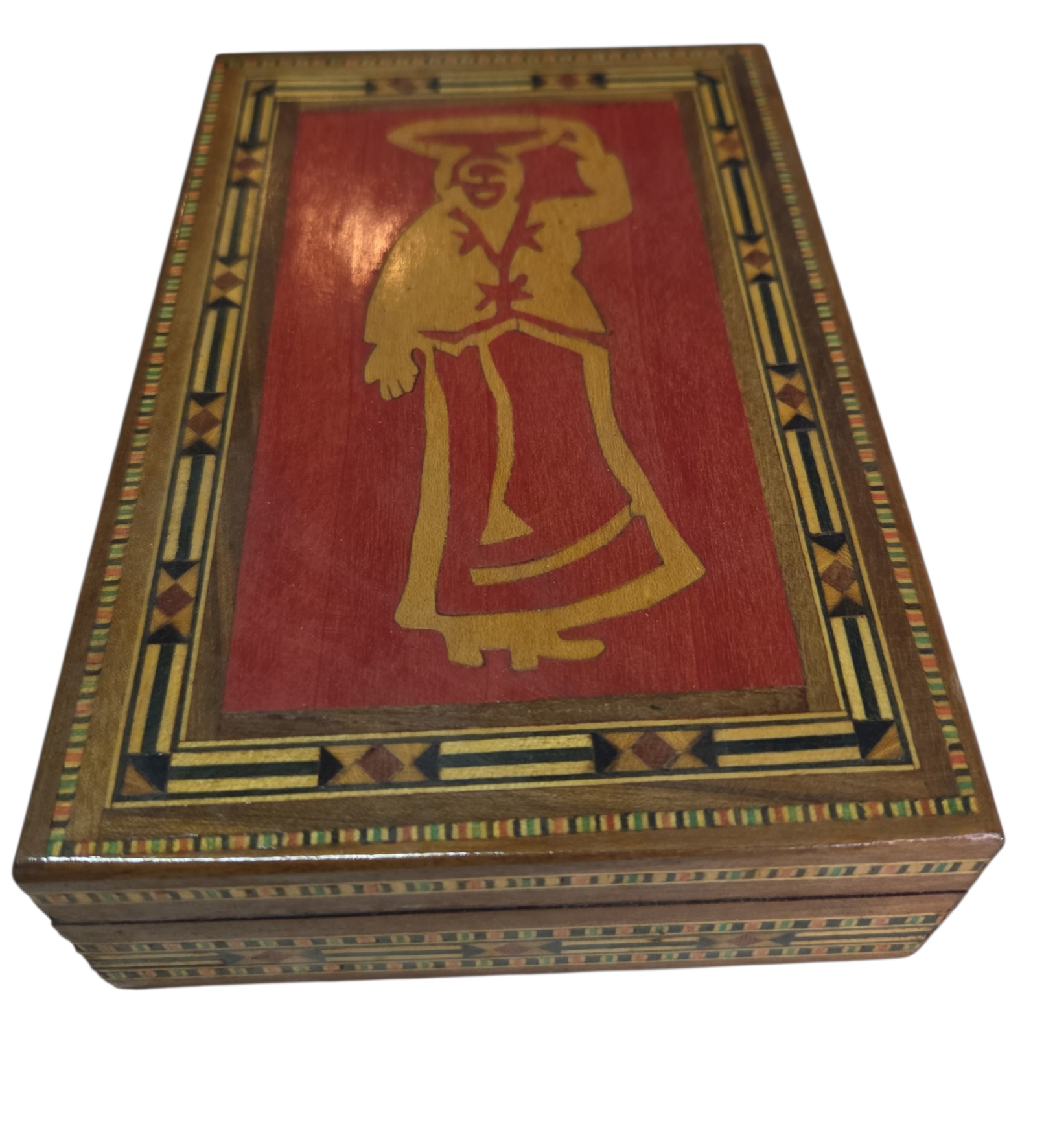 Uma belíssima peça de artesanato técnico, esta caixa apresenta um trabalho de marchetaria minucioso, com bordas geométricas multicoloridas que emolduram uma figura central clássica. O contraste entre o fundo avermelhado e a figura em madeira clara destaca o trabalho manual de incrustação. Ideal para colecionadores de arte popular ou para quem busca uma peça decorativa com forte identidade cultural.