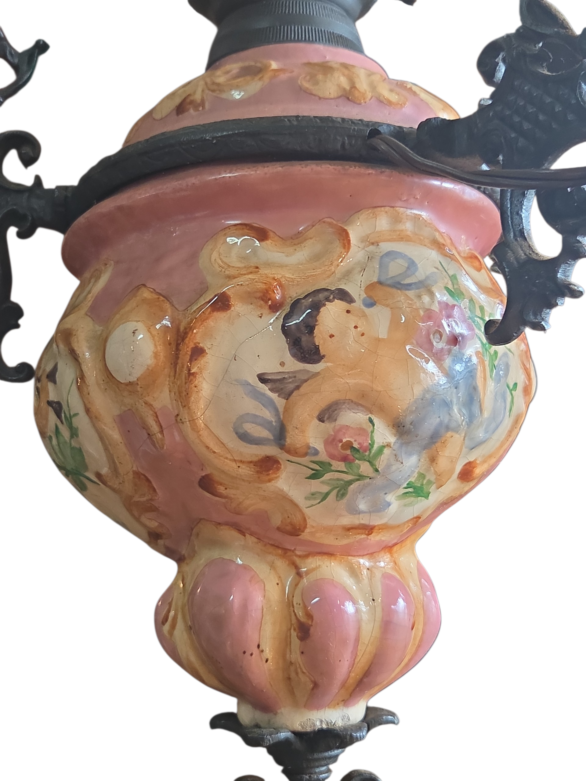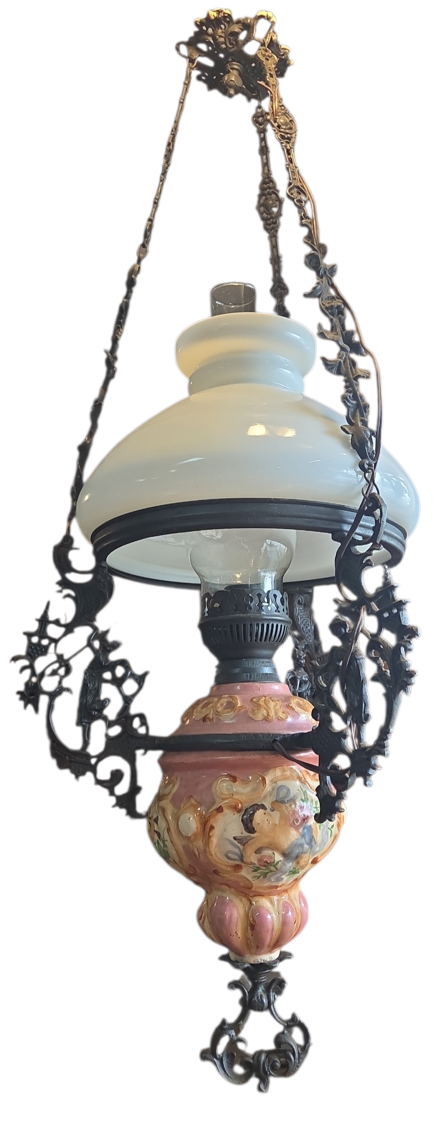Lustre antigo decorativo, combinando a robustez do ferro com a delicadeza de detalhes em cerâmica esmaltada. Conta com cúpula em opalina, garantindo uma iluminação suave e elegante.