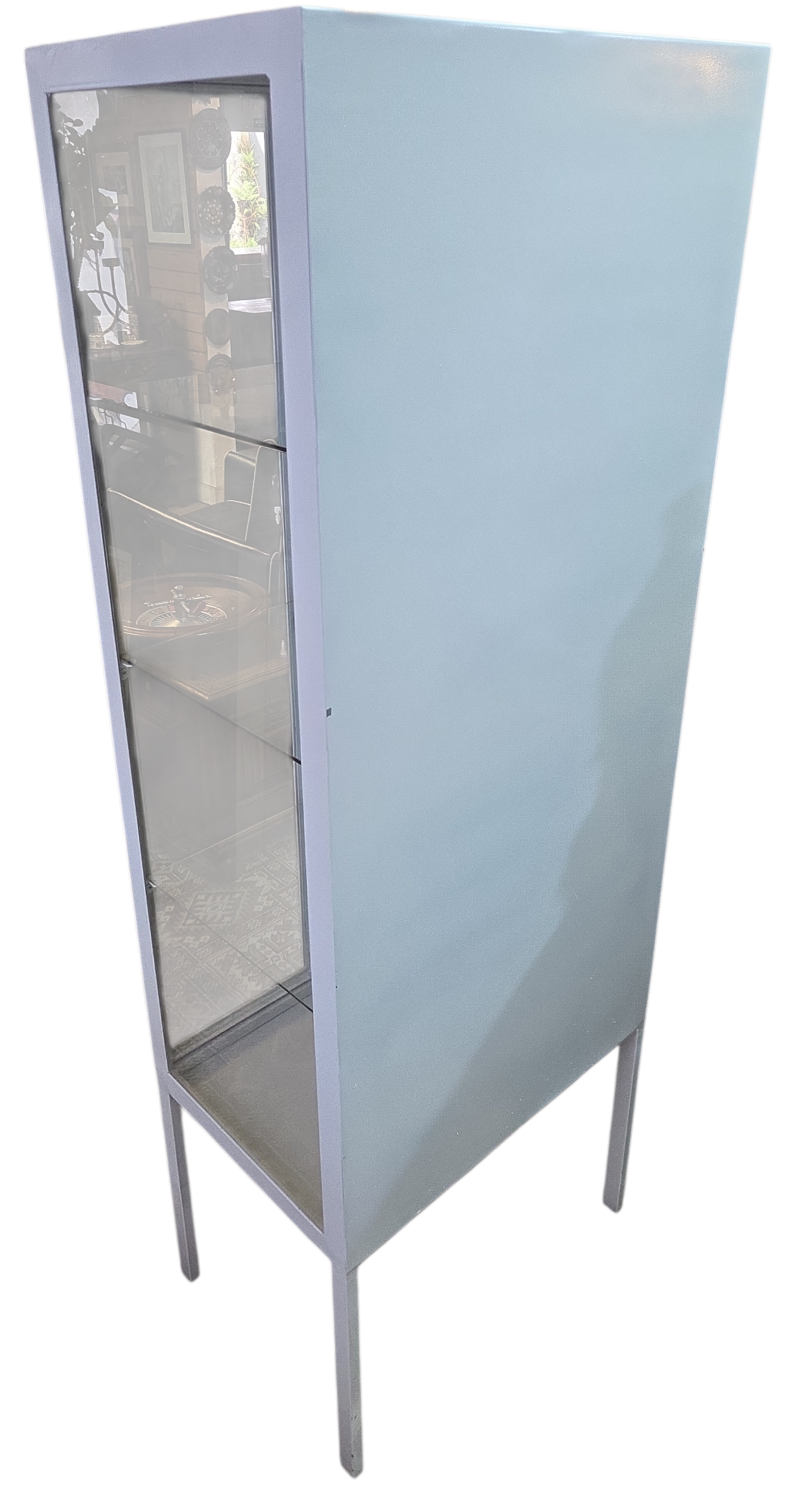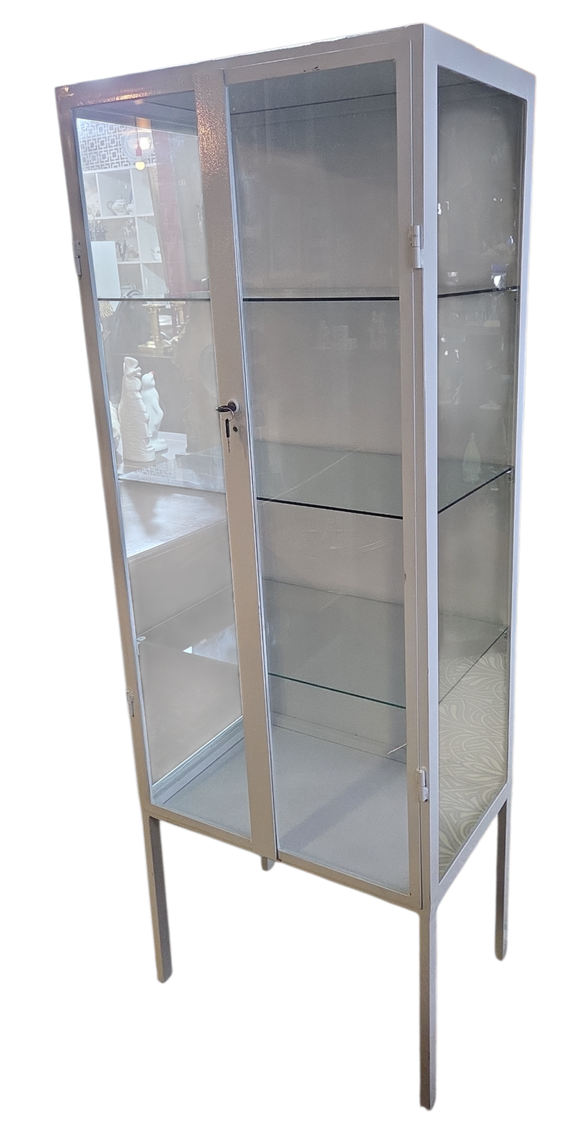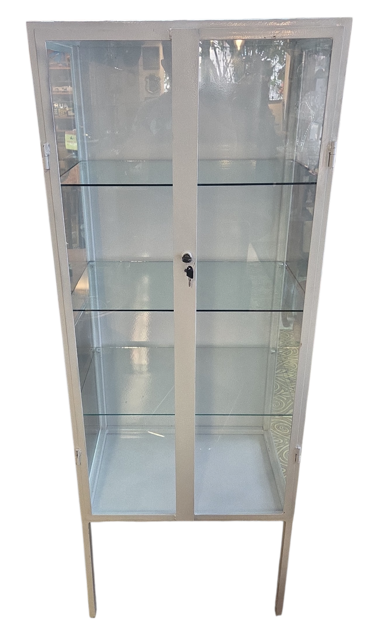 Autêntica cristaleira hospitalar vintage, popularmente conhecida como "farmacinha". Esta peça combina a robustez do mobiliário industrial de meados do século XX com uma estética minimalista e funcional, ideal para quem busca um toque de originalidade na decoração contemporânea.