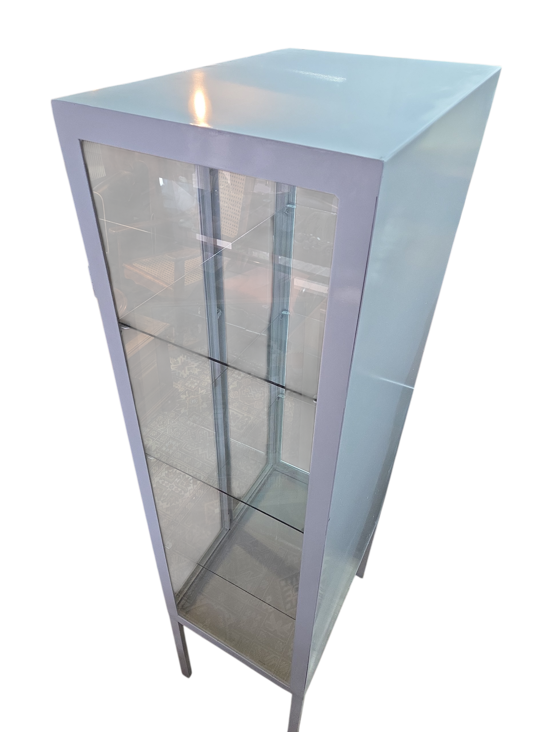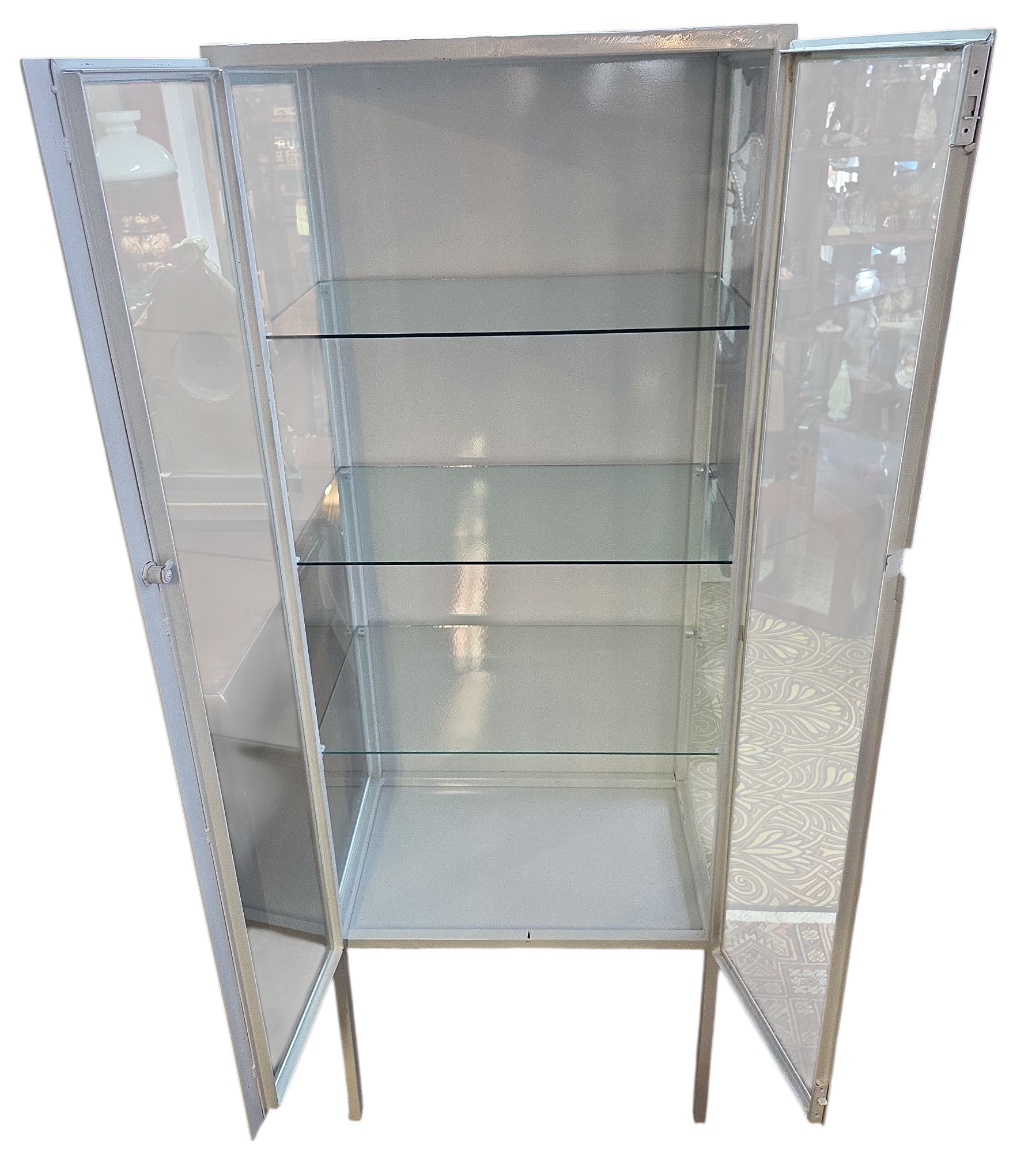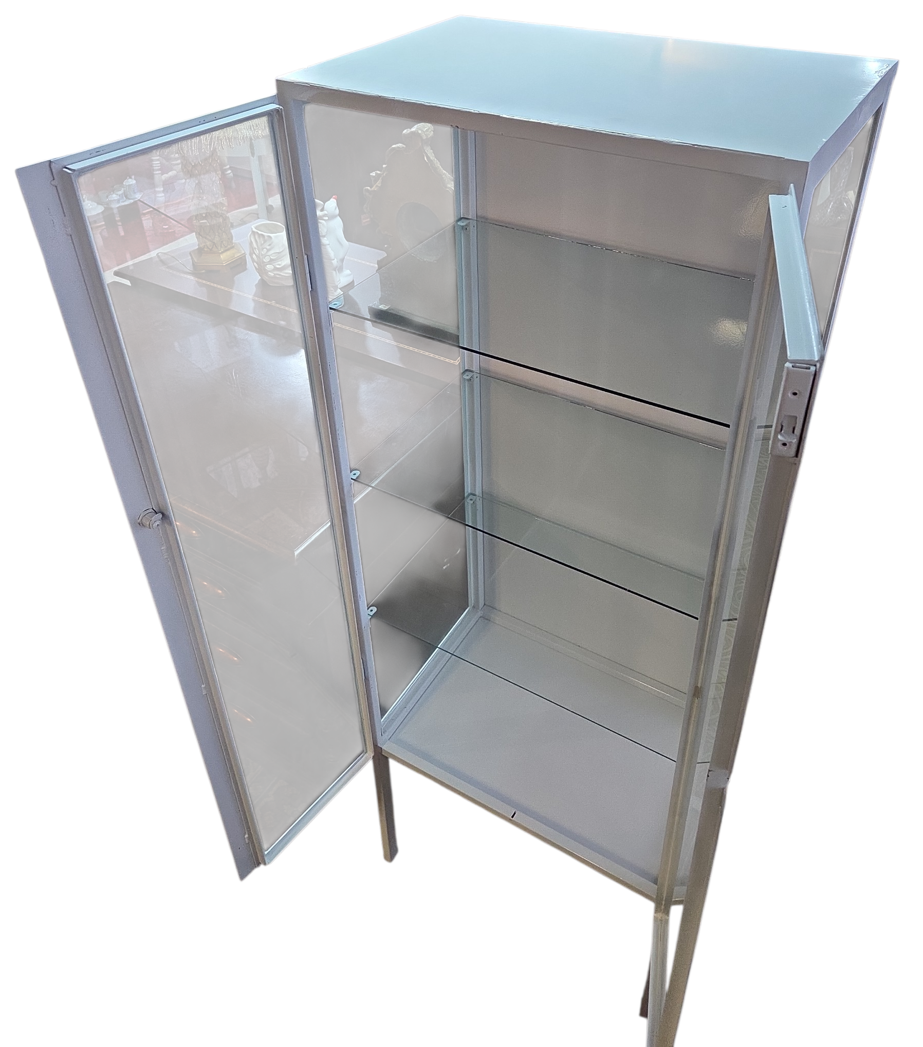 Autêntica cristaleira hospitalar vintage, popularmente conhecida como "farmacinha". Esta peça combina a robustez do mobiliário industrial de meados do século XX com uma estética minimalista e funcional, ideal para quem busca um toque de originalidade na decoração contemporânea.