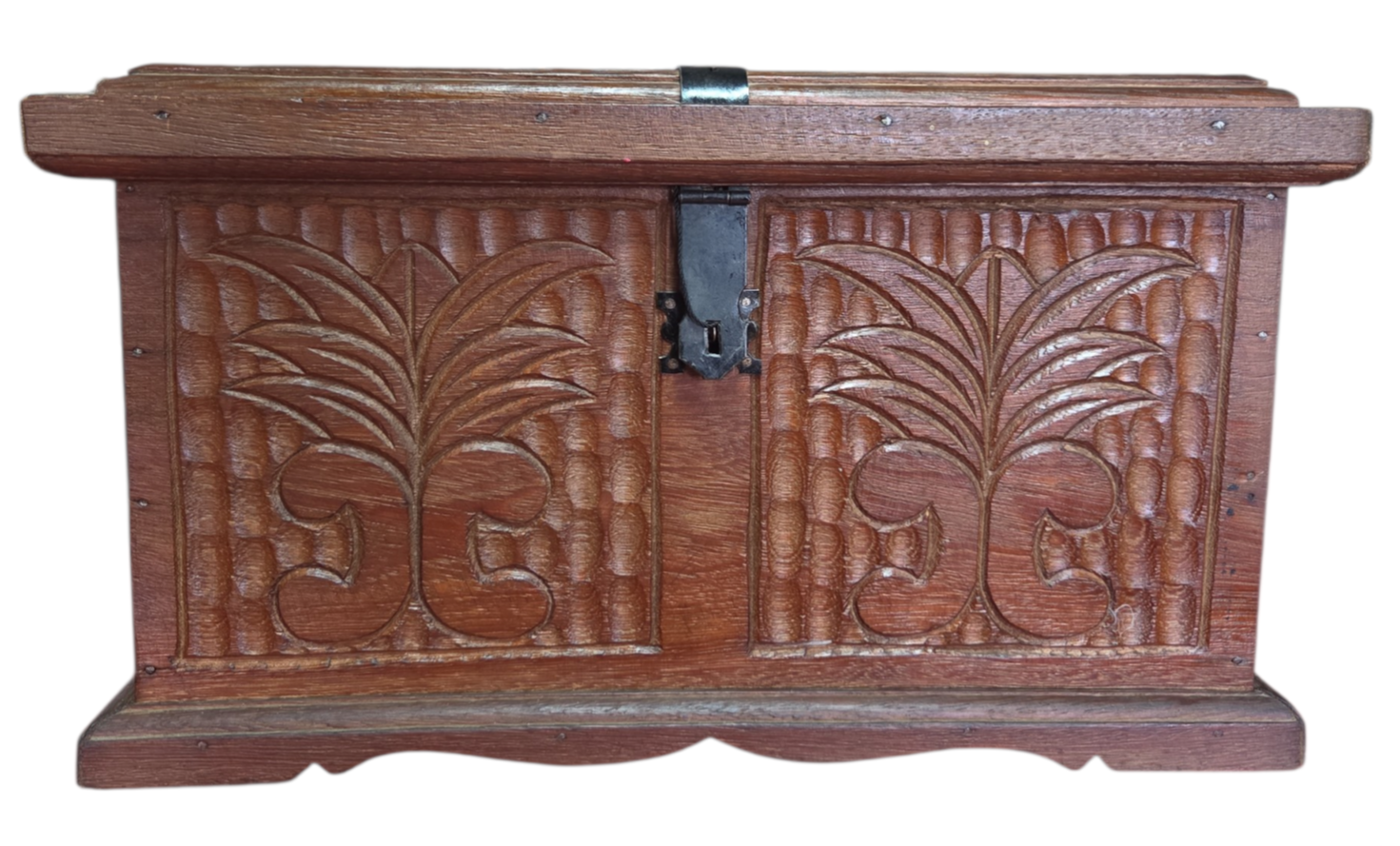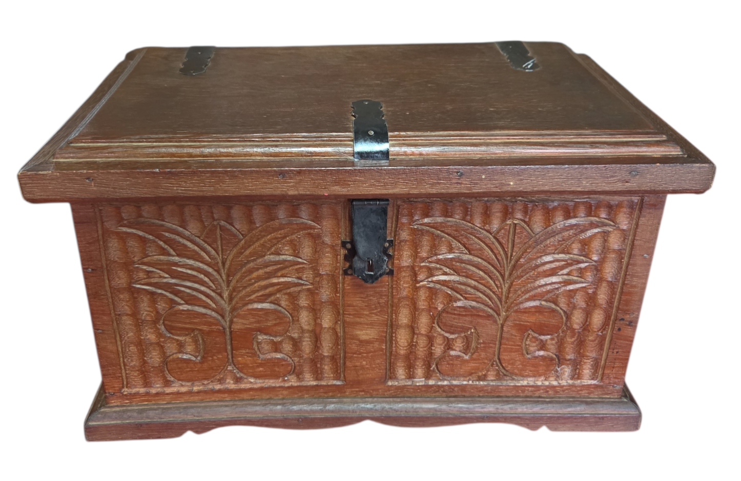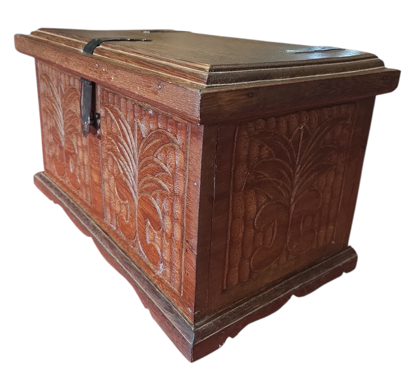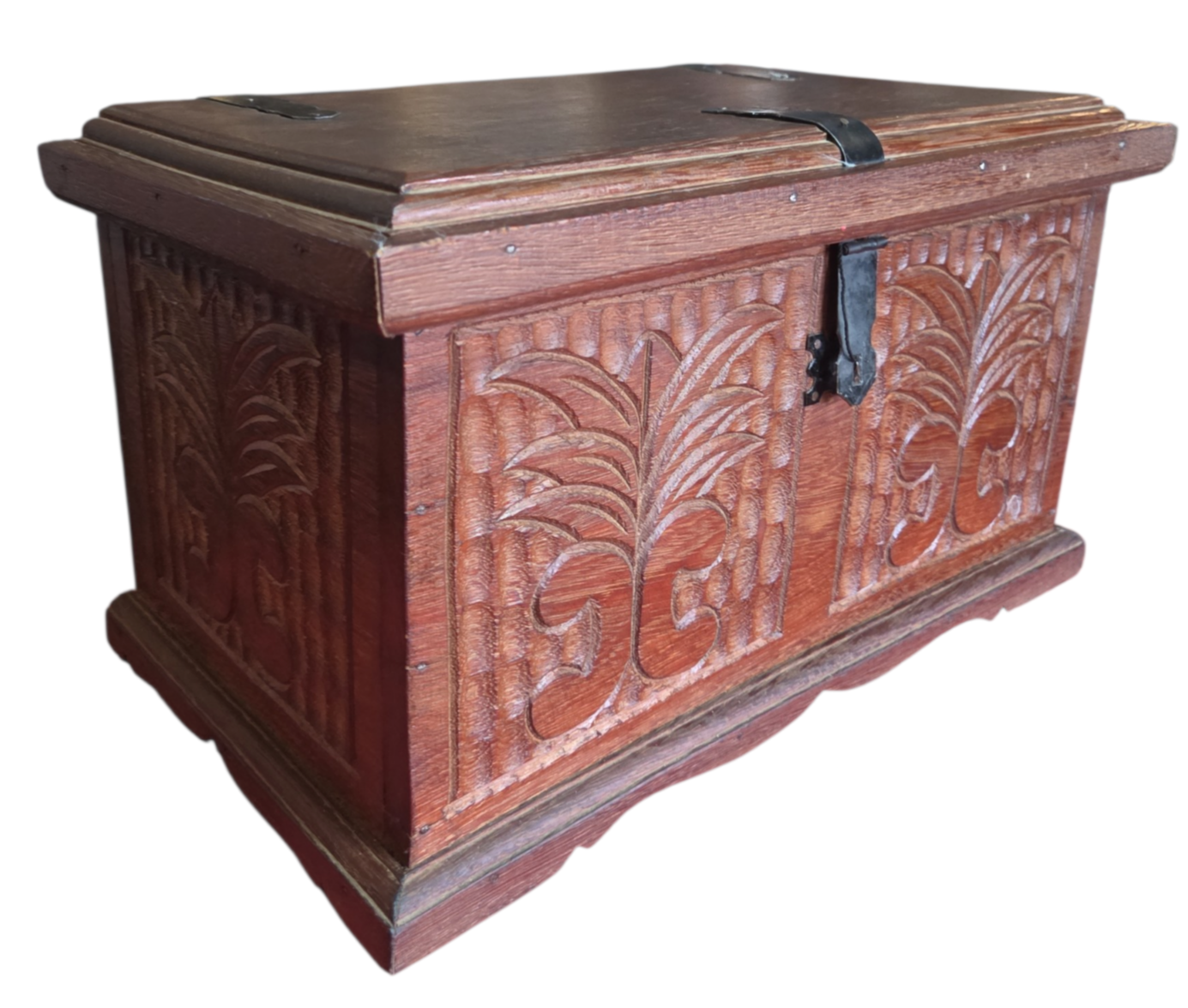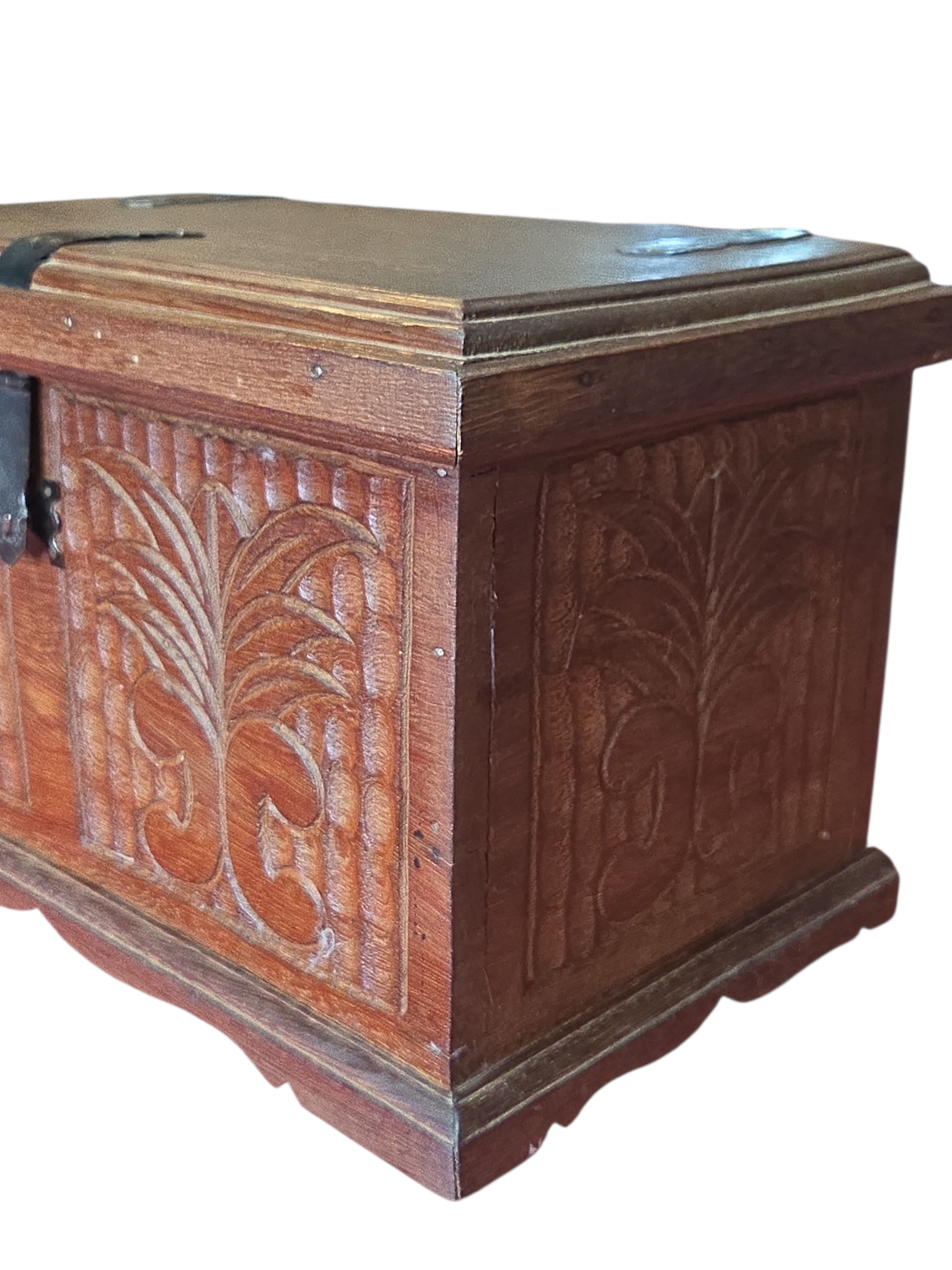 Este charmoso baú em madeira maciça apresenta um trabalho artesanal rico em detalhes. A face frontal e as laterais são adornadas com entalhes profundos representando folhagens estilizadas sobre um fundo texturizado. Possui ferragens em metal escurecido com design clássico, incluindo um fecho frontal funcional e dobradiças aparentes que reforçam seu caráter rústico e histórico.