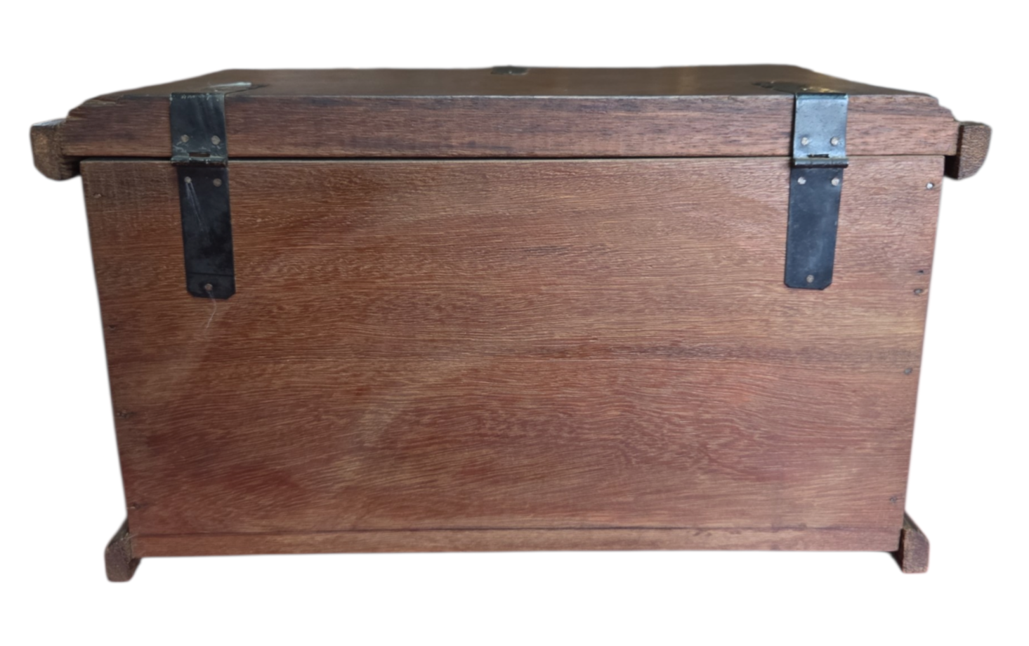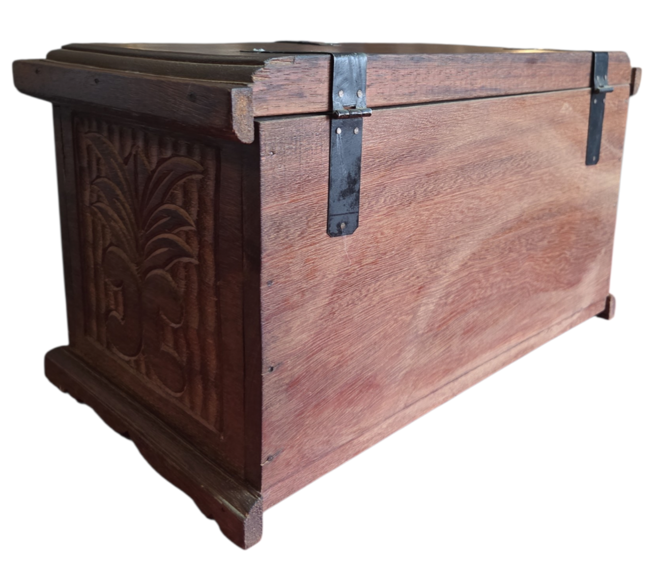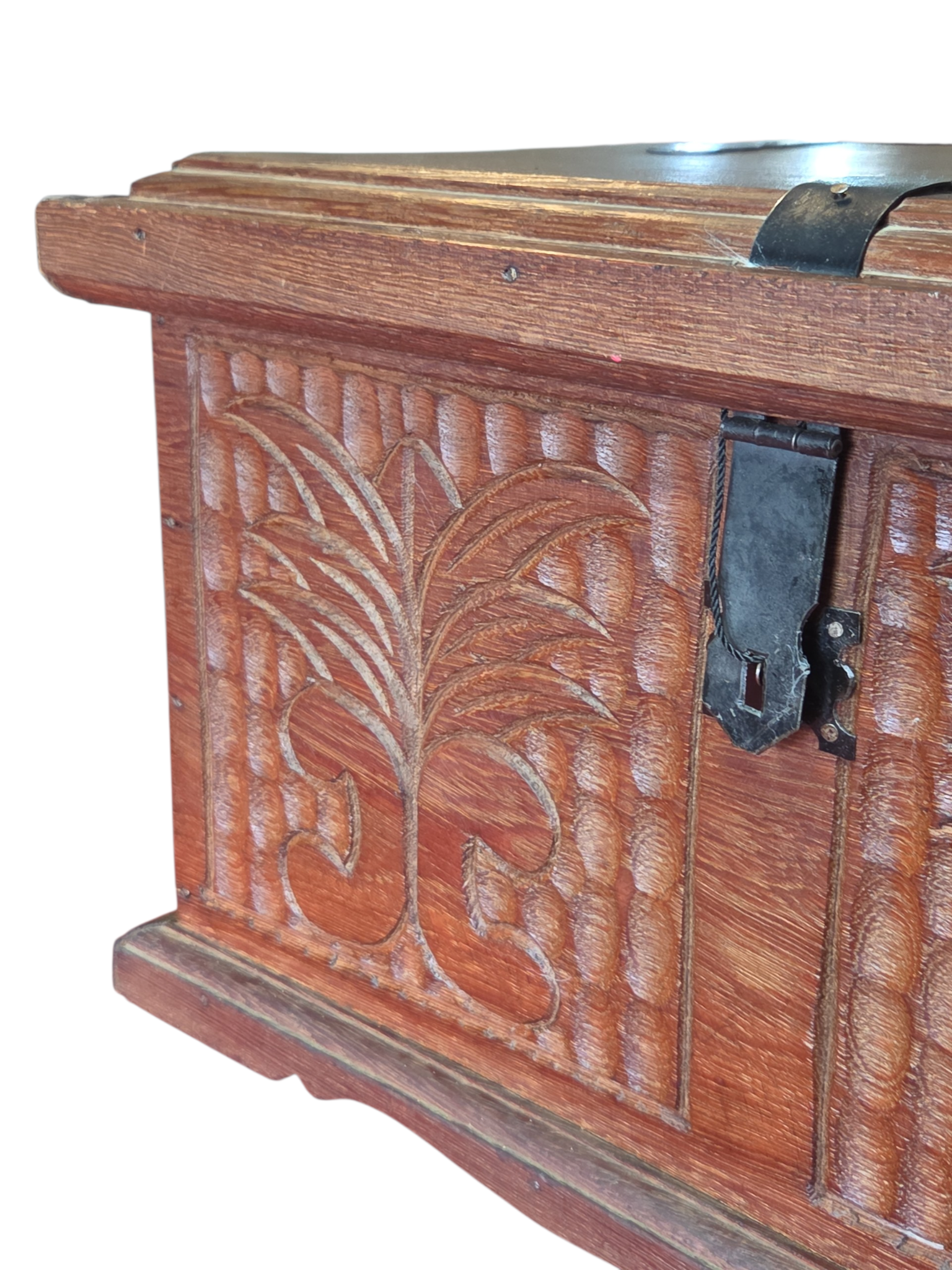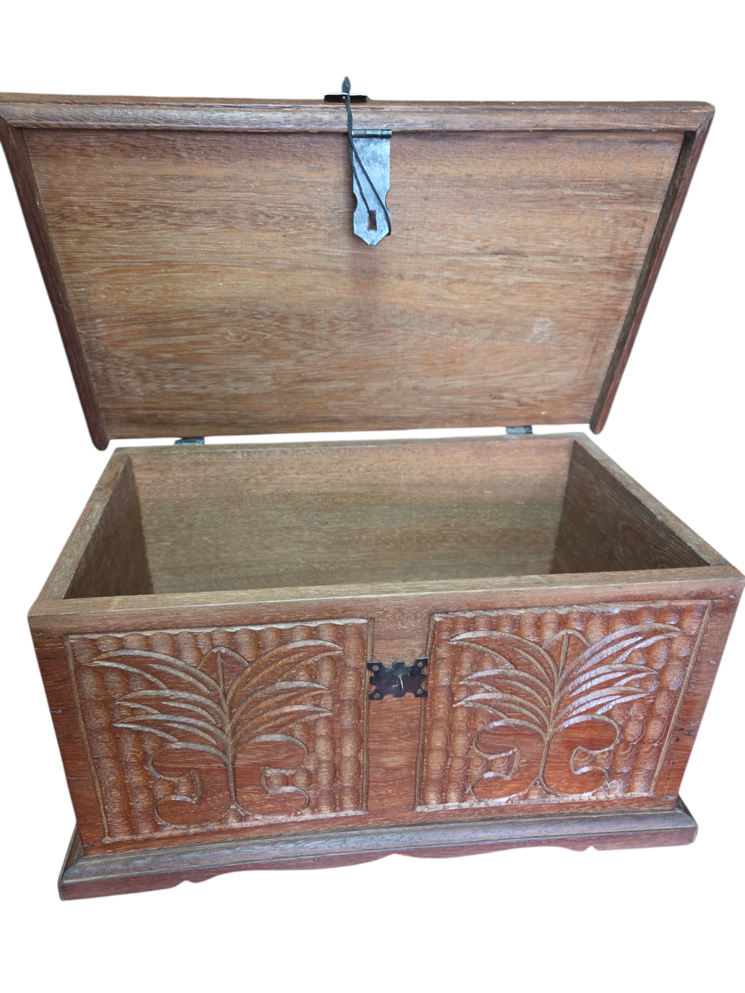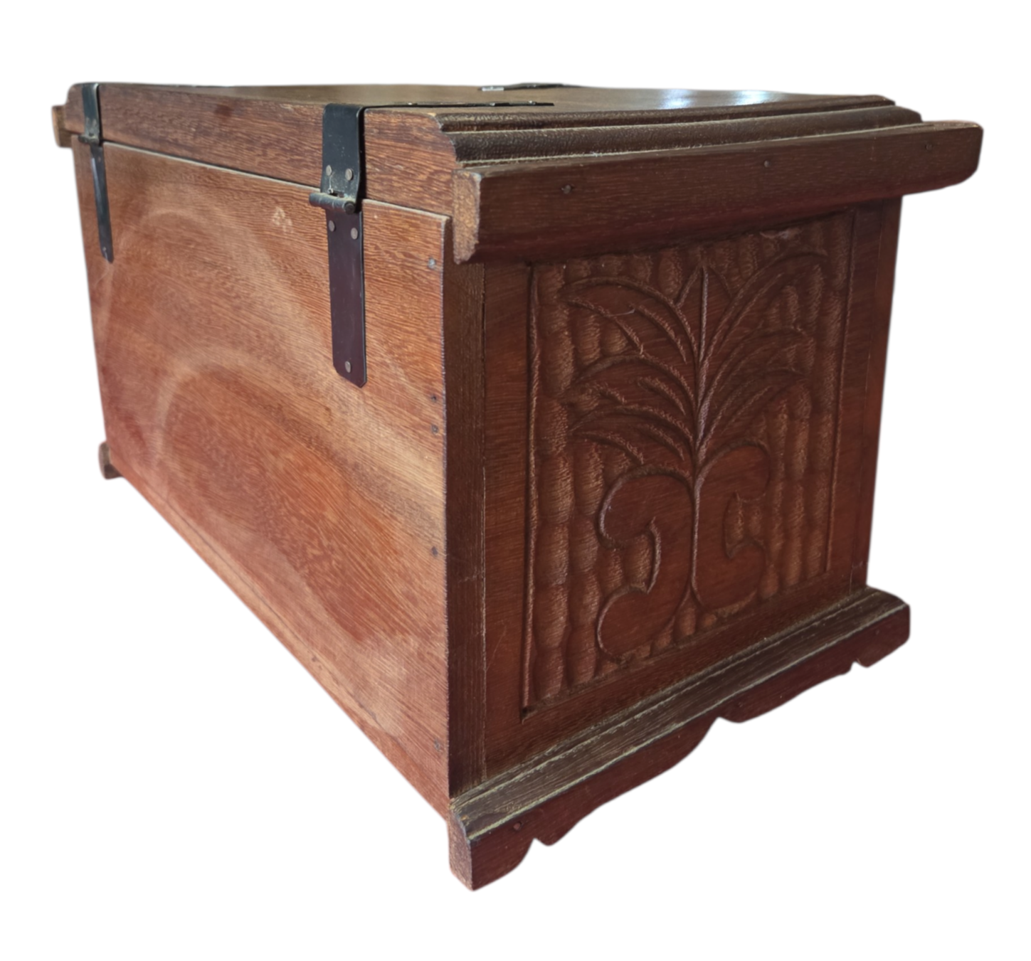 Este charmoso baú em madeira maciça apresenta um trabalho artesanal rico em detalhes. A face frontal e as laterais são adornadas com entalhes profundos representando folhagens estilizadas sobre um fundo texturizado. Possui ferragens em metal escurecido com design clássico, incluindo um fecho frontal funcional e dobradiças aparentes que reforçam seu caráter rústico e histórico.