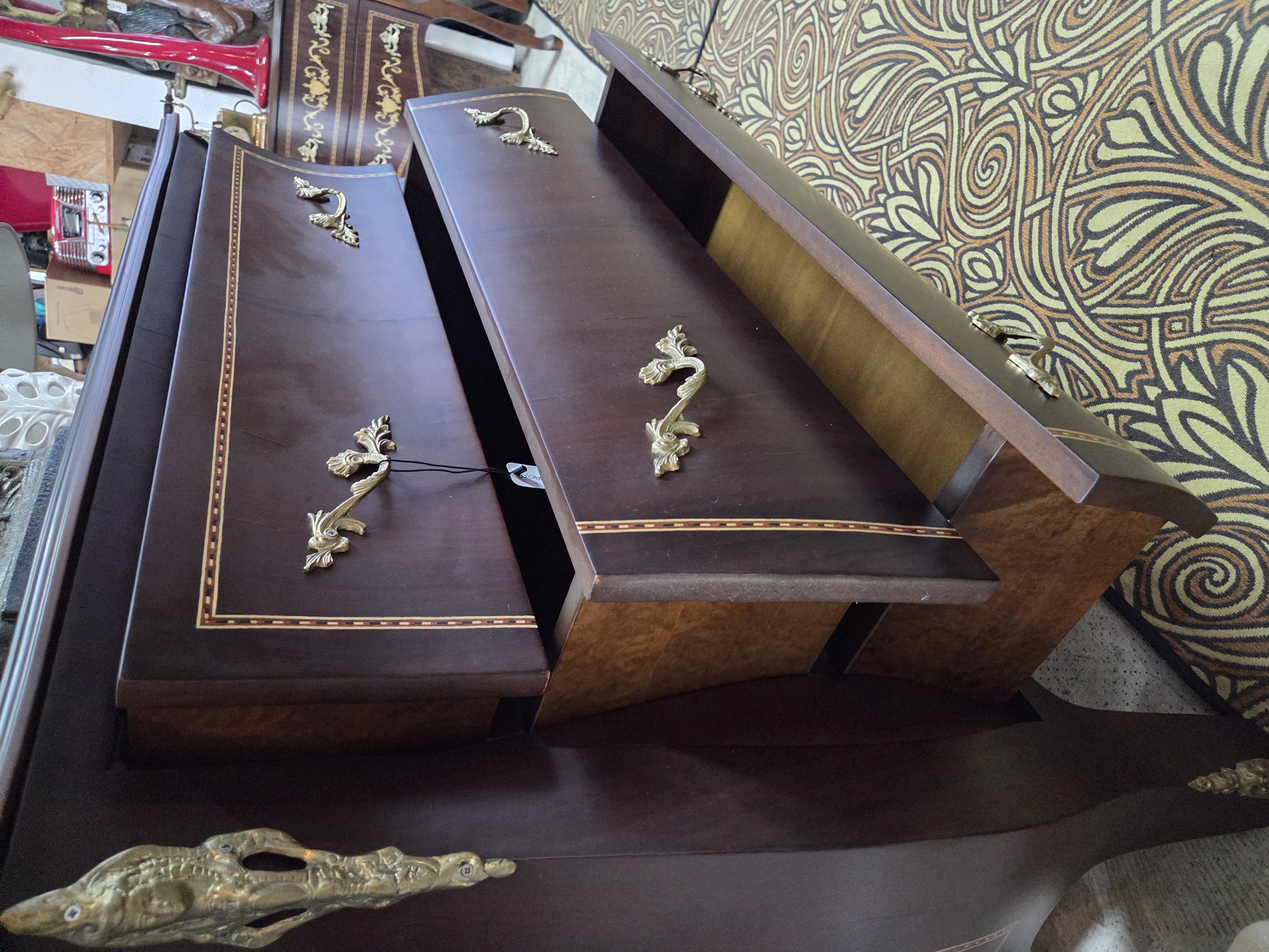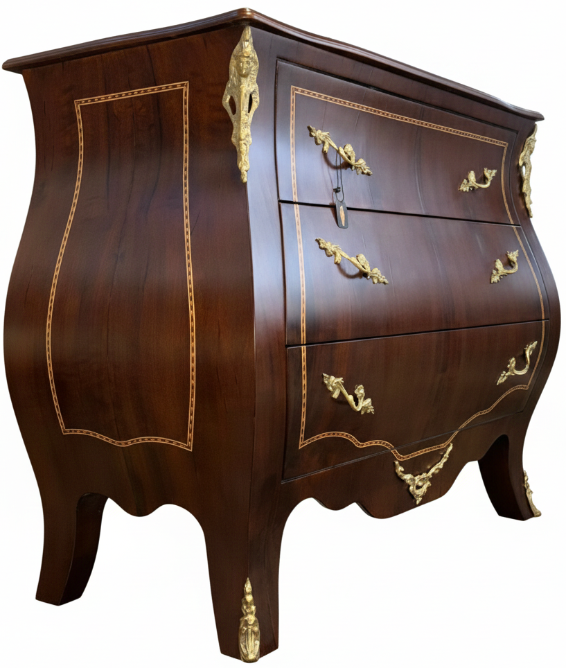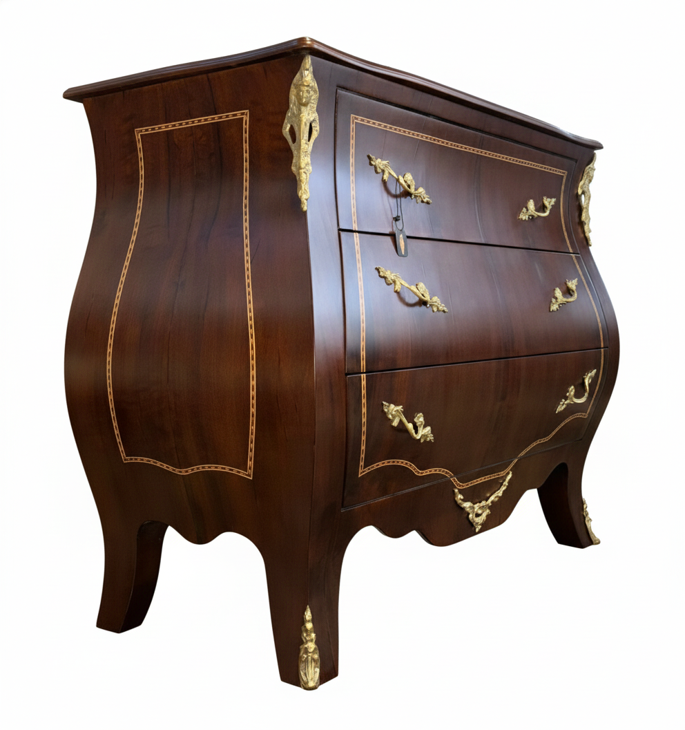 Esta Cômoda Bombê é uma peça magnífica que representa o auge do mobiliário de alto padrão. Construída em imbuia nobre, sua estrutura apresenta as curvas sinuosas e elegantes características do estilo, sendo uma verdadeira declaração de luxo e bom gosto.