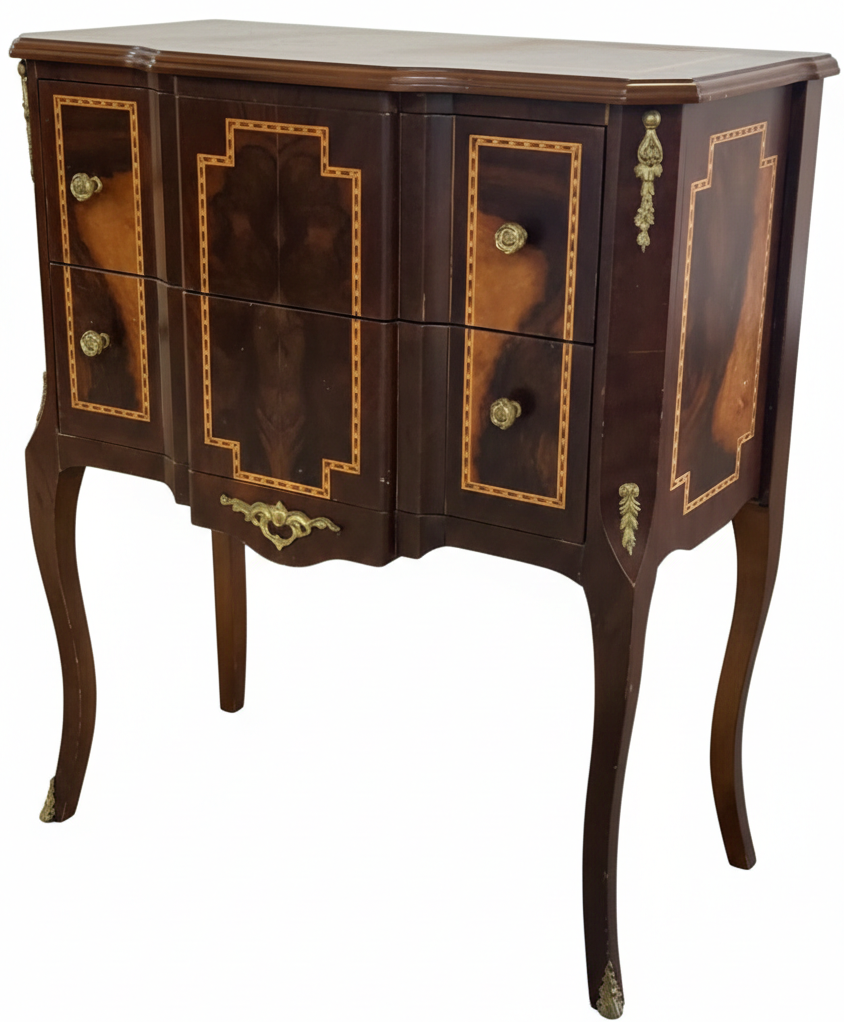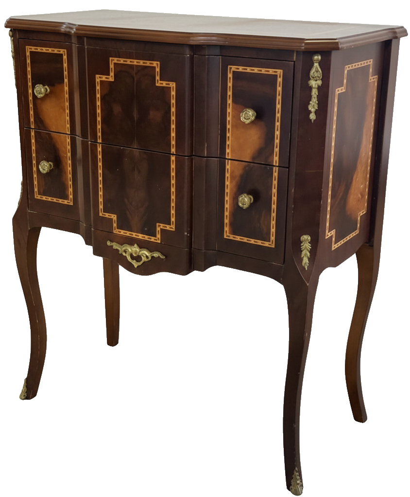 Apresentamos esta belíssima peça que combina a funcionalidade de uma cômoda compacta com o requinte de uma mesa de cabeceira de luxo. Construída com lâmina de imbuia selecionada, o móvel destaca-se pelo seu impecável trabalho de marchetaria geométrica nas frentes e laterais.