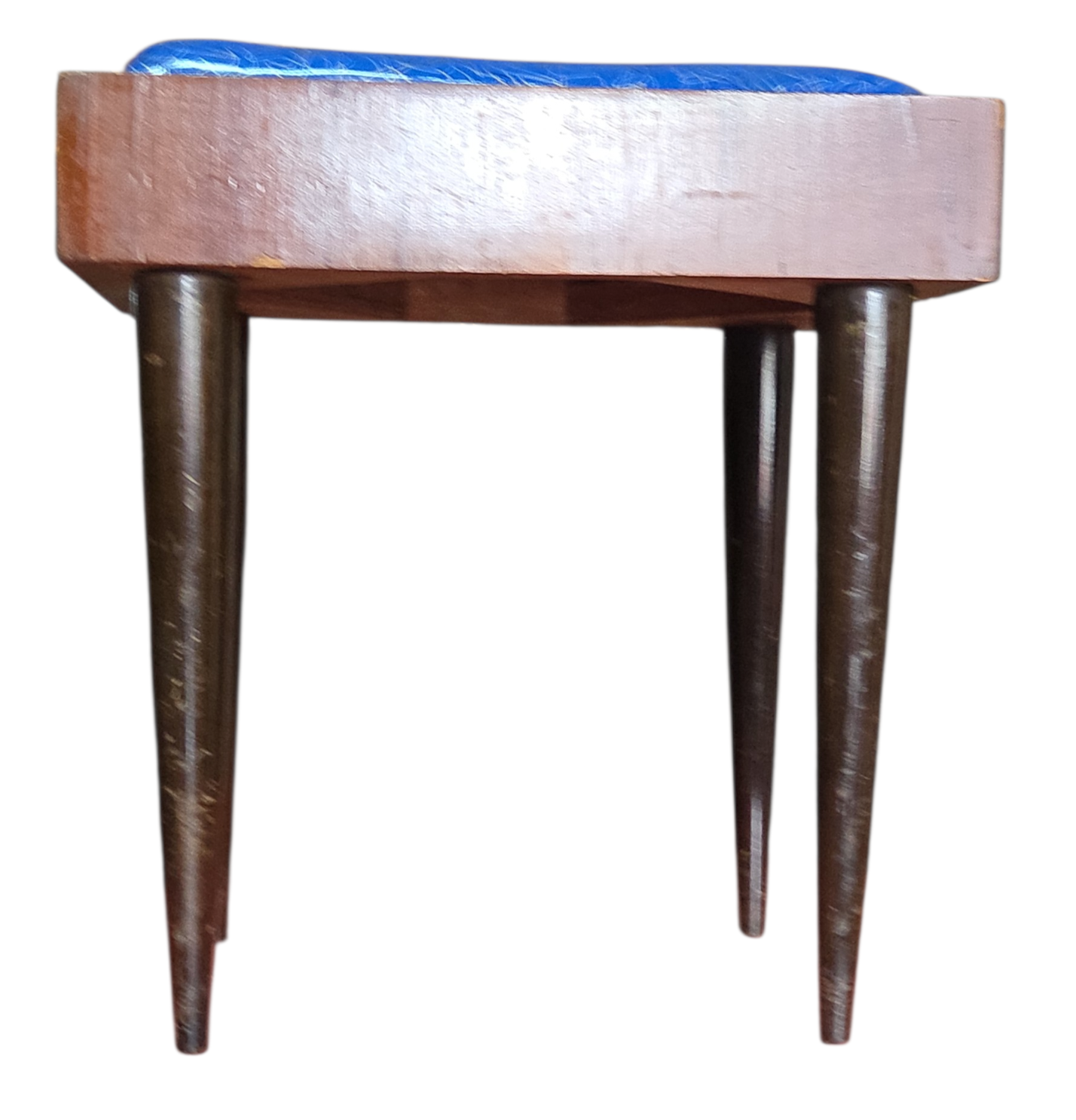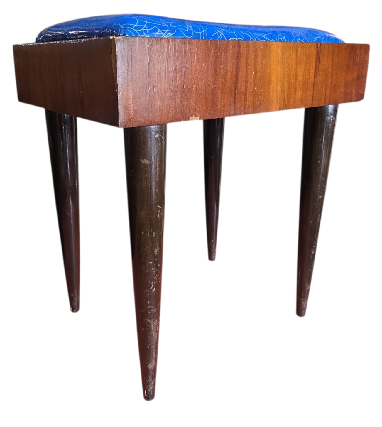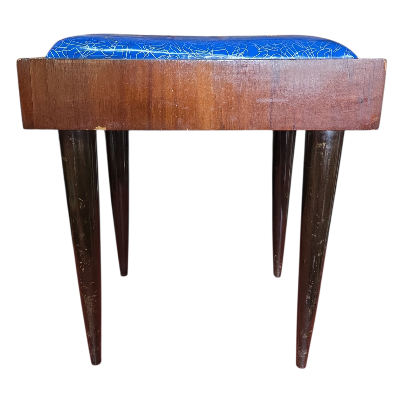 Reviva a era de ouro do design com esta banqueta icônica dos anos 50! Com os clássicos pés palito cônicos e um tampo de madeira robusto, o grande destaque é o assento original em vinil azul com o raríssimo padrão "bumerangue" branco. Uma peça cheia de personalidade e história.