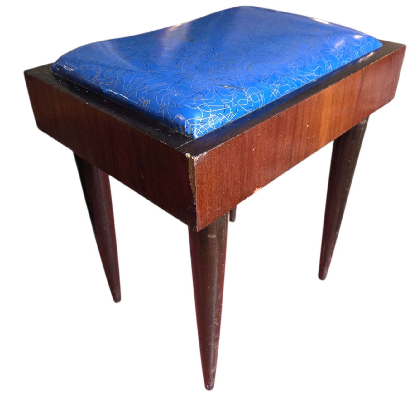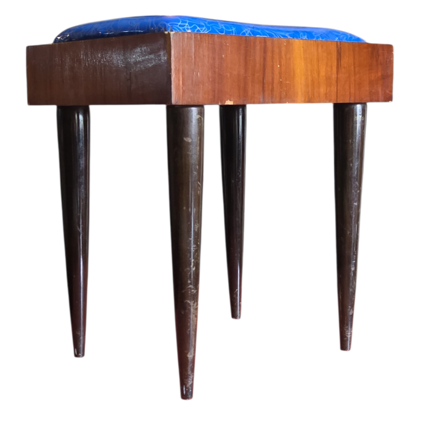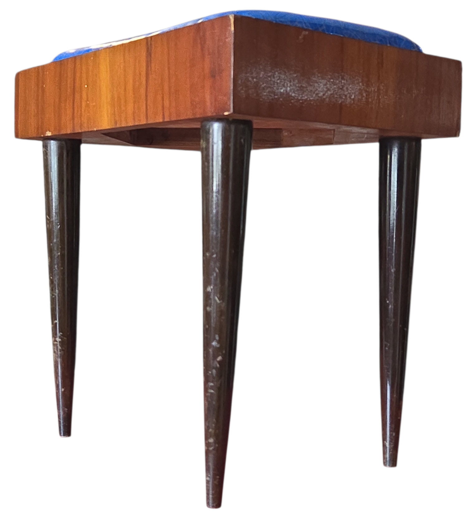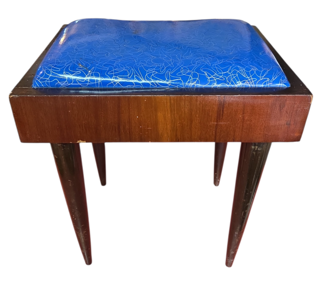 Reviva a era de ouro do design com esta banqueta icônica dos anos 50! Com os clássicos pés palito cônicos e um tampo de madeira robusto, o grande destaque é o assento original em vinil azul com o raríssimo padrão "bumerangue" branco. Uma peça cheia de personalidade e história.