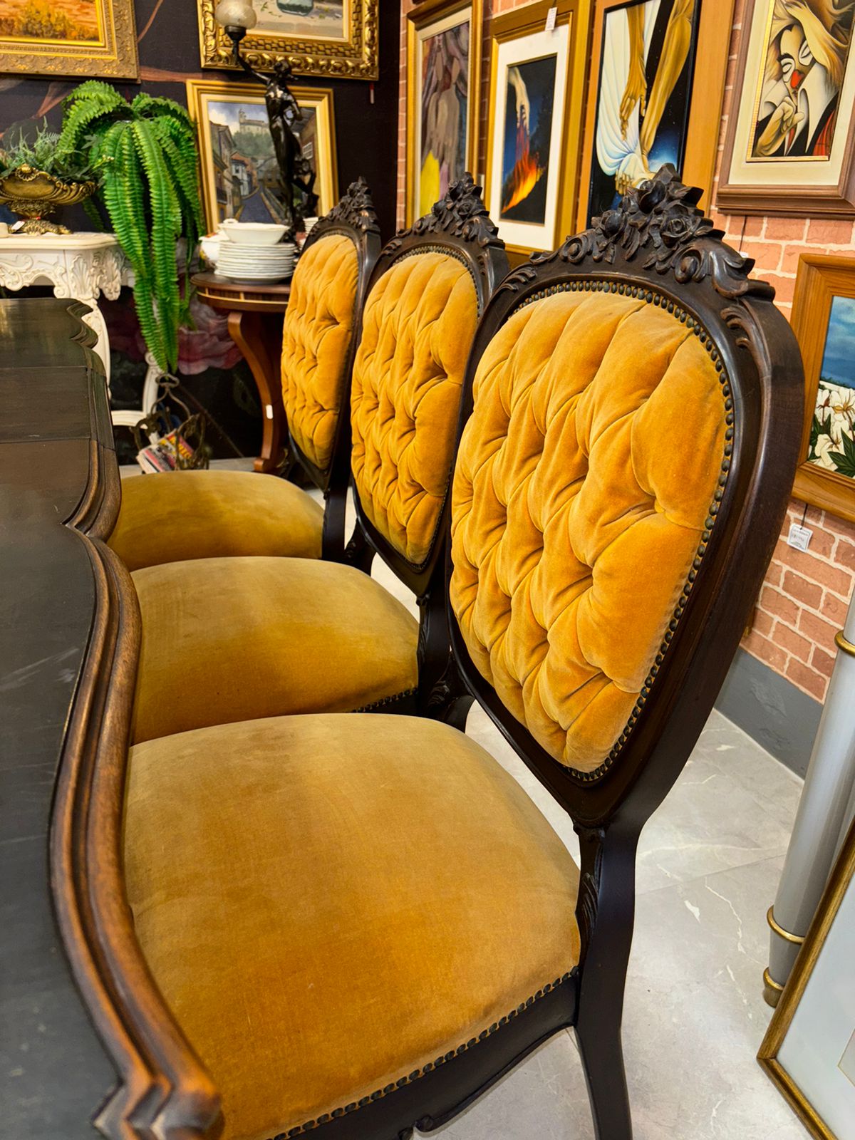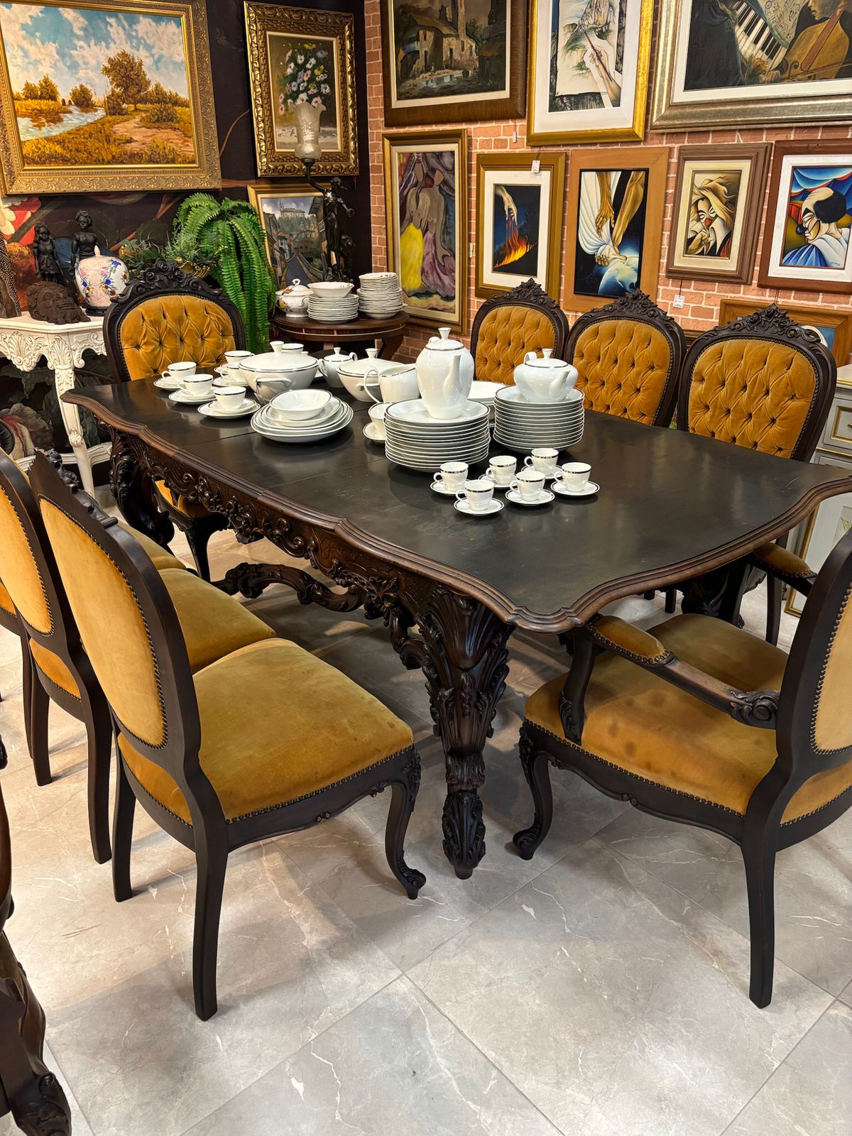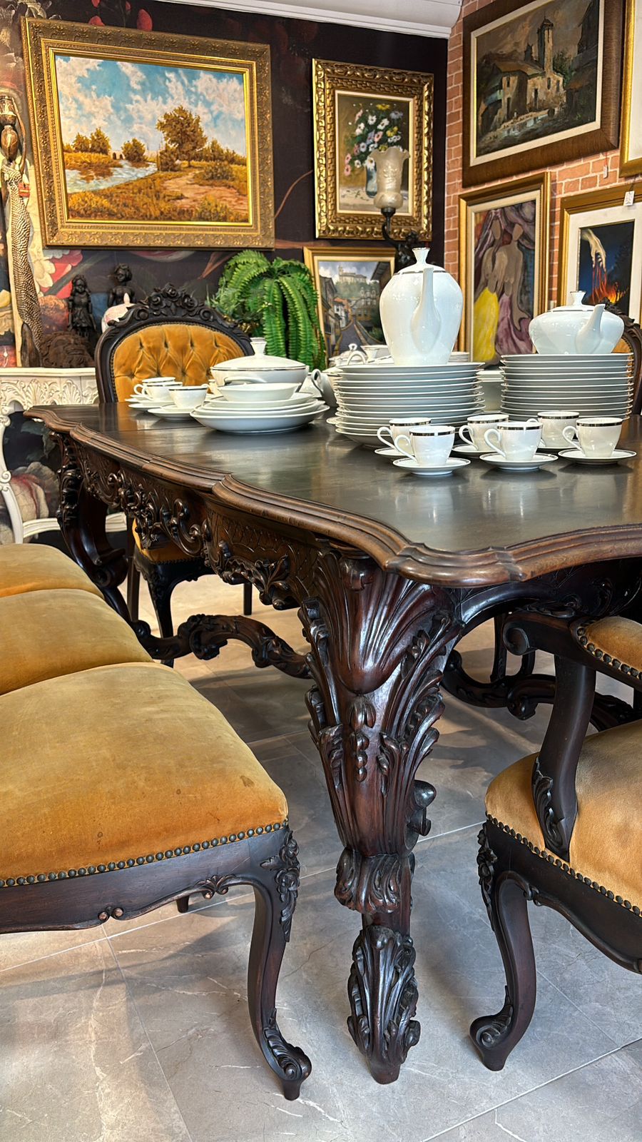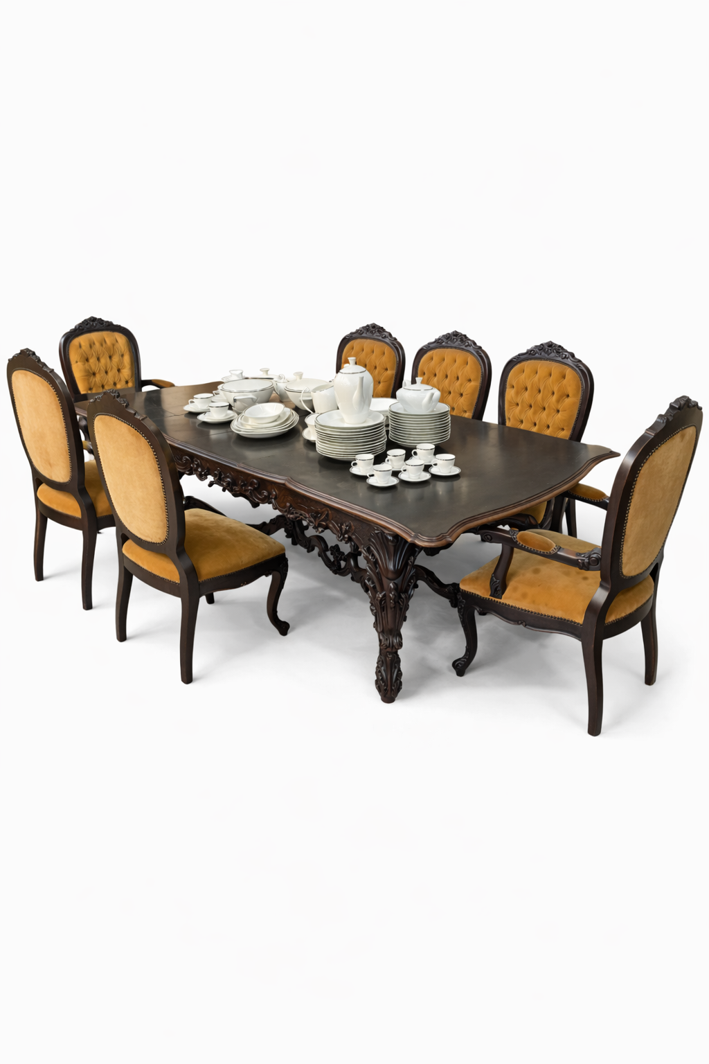 A mesa apresenta entalhes ricos e bem definidos, evidenciando o trabalho artesanal da época. O conjunto é composto por 6 cadeiras e 2 poltronas, todas com estrutura robusta e design clássico, que oferecem conforto aliado à imponência estética.