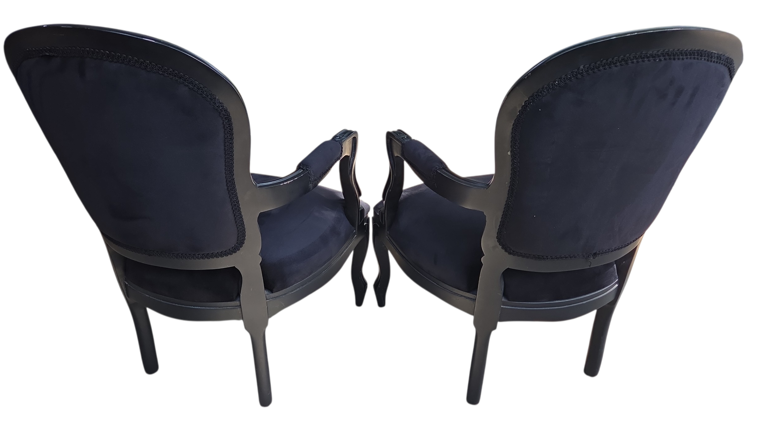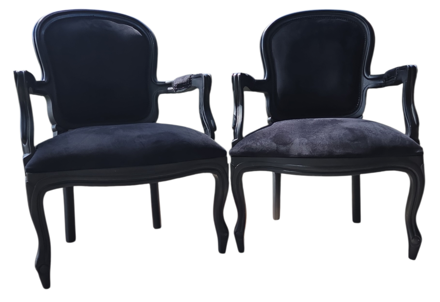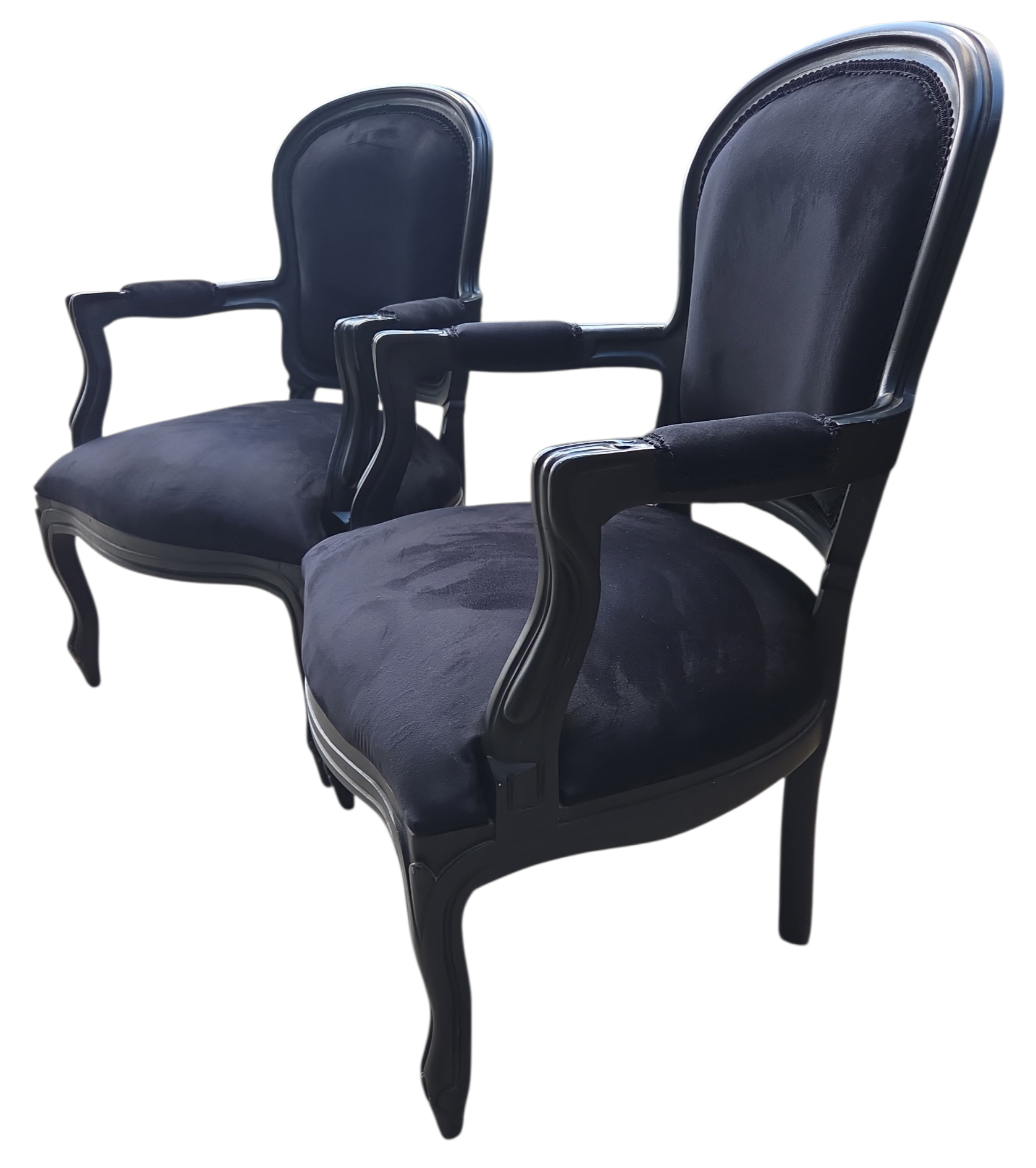 Lindo par de poltronas clássicas em estilo Luis XV, com estrutura em madeira trabalhada e entalhes manuais. Peças autênticas com marcas do tempo e uso, ideais para quem busca um visual vintage original