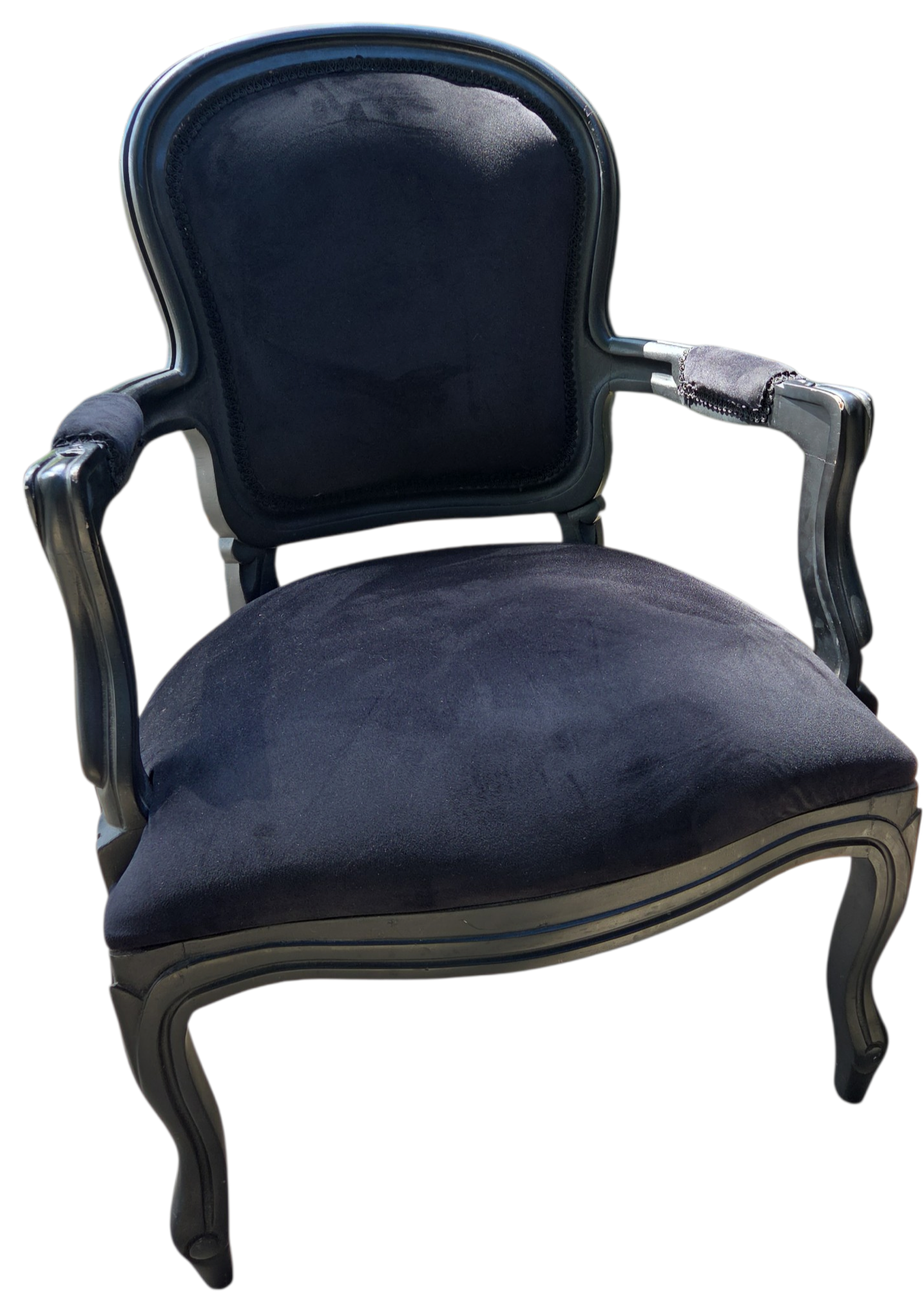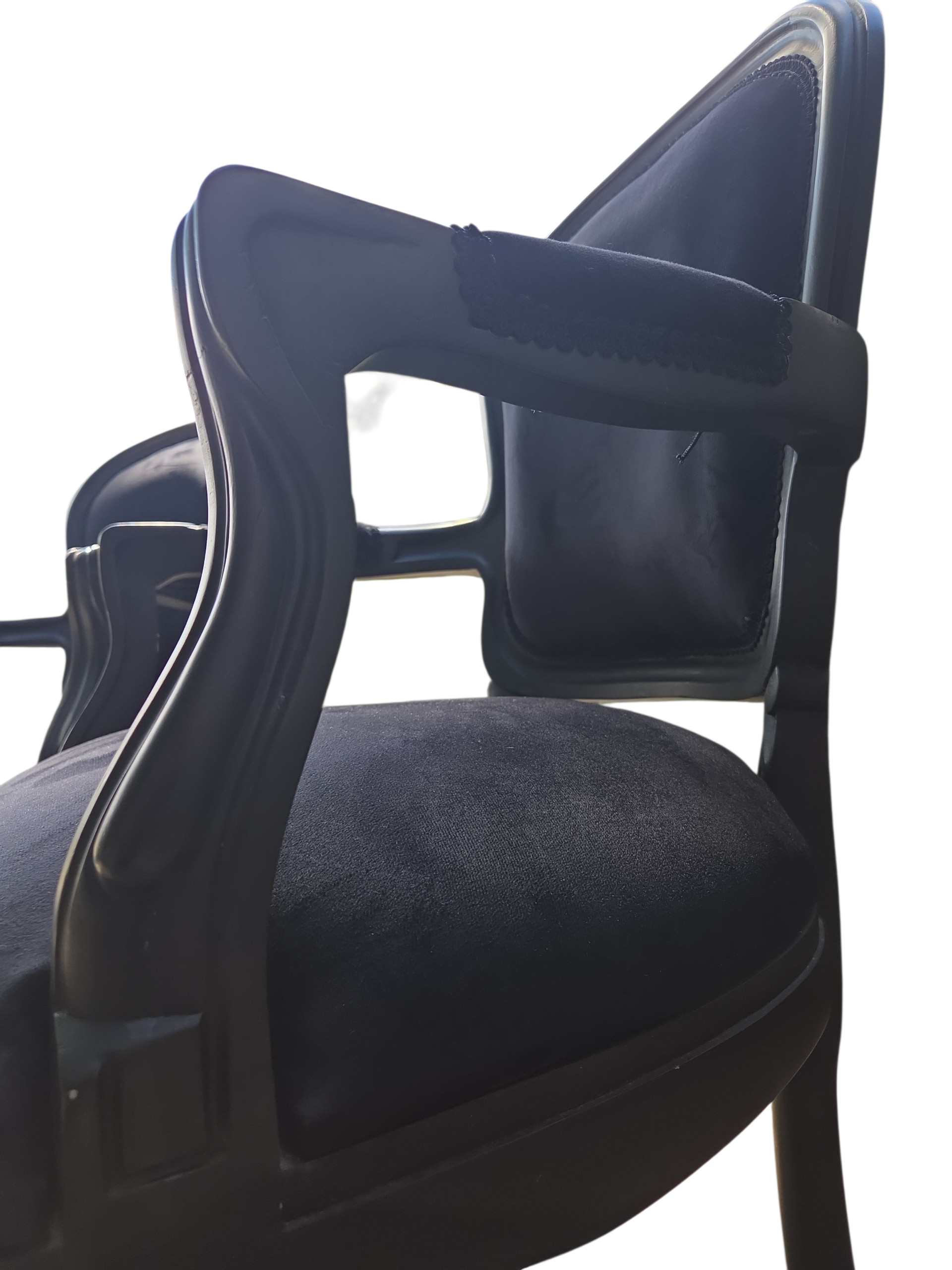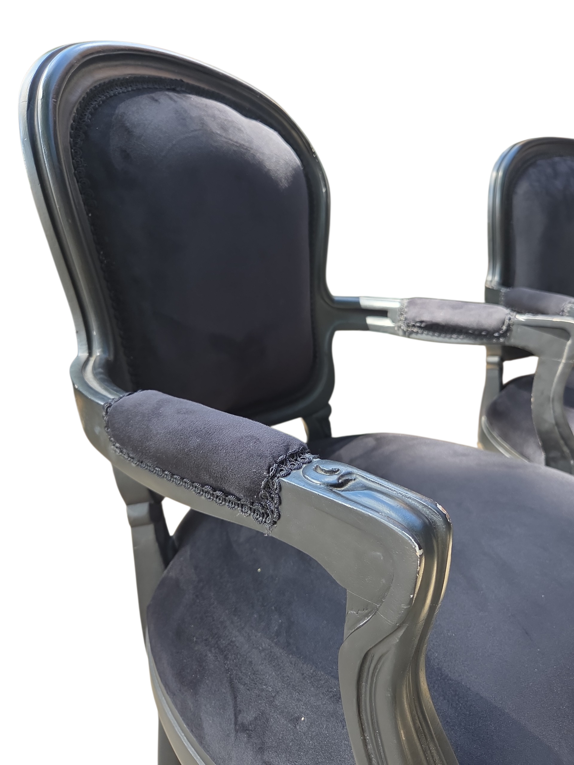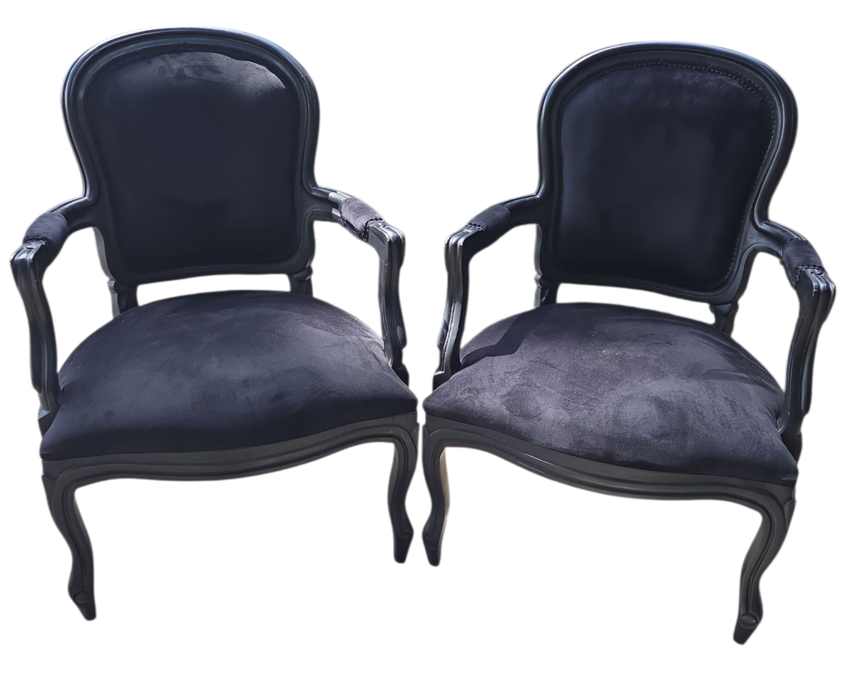 Lindo par de poltronas clássicas em estilo Luis XV, com estrutura em madeira trabalhada e entalhes manuais. Peças autênticas com marcas do tempo e uso, ideais para quem busca um visual vintage original