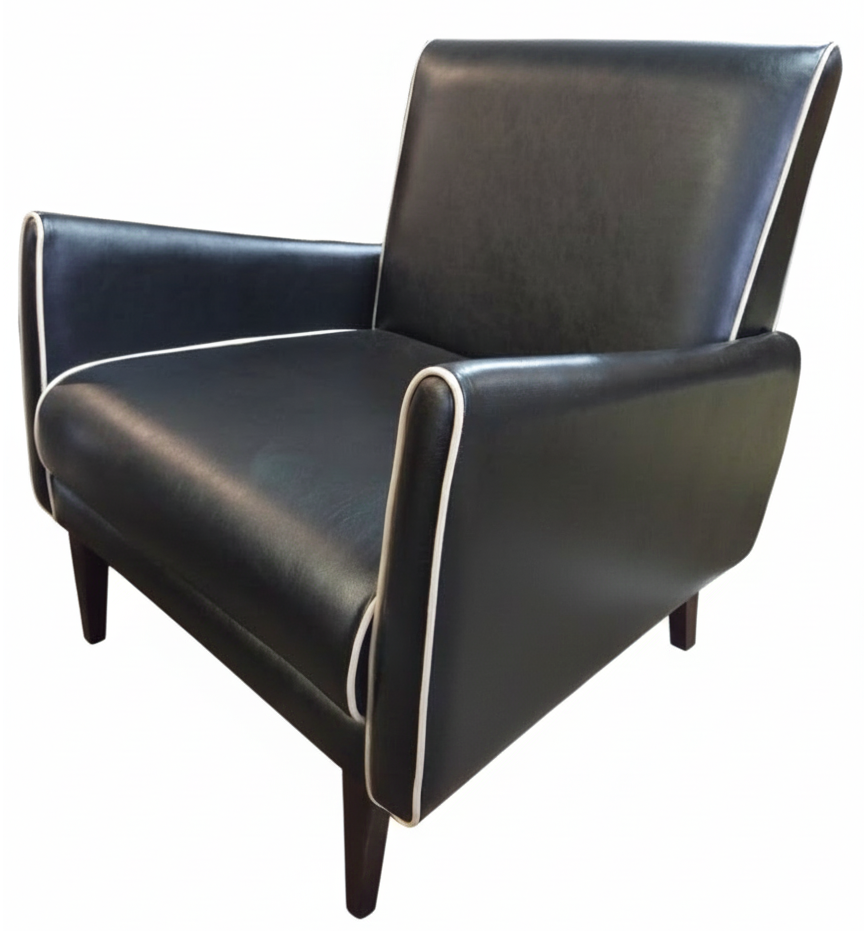 Contraste Sofisticado: Revestida em courvin preto de alta resistência, com o clássico detalhe em debrum creme, que valoriza o desenho curvo e as linhas do assento.