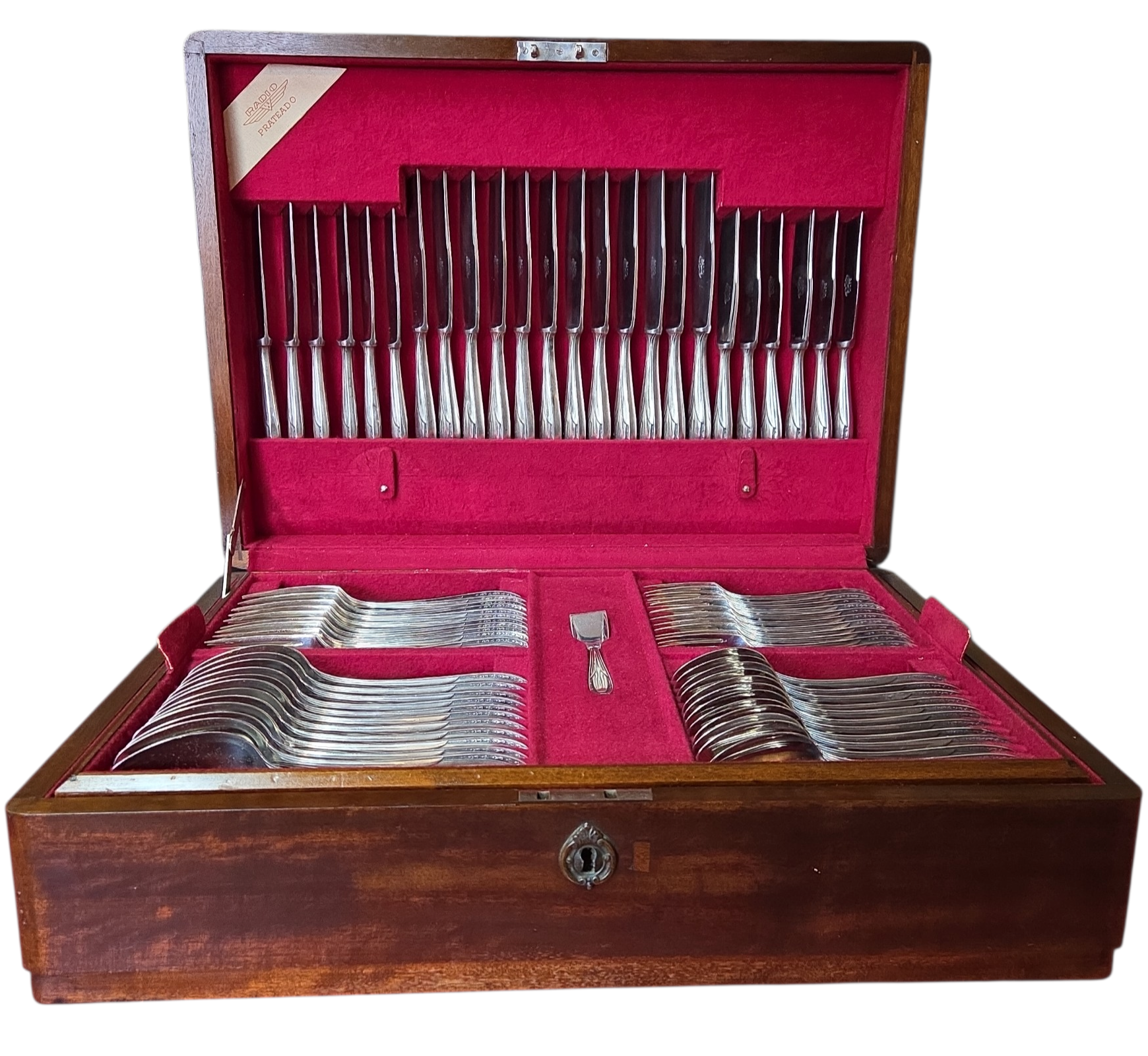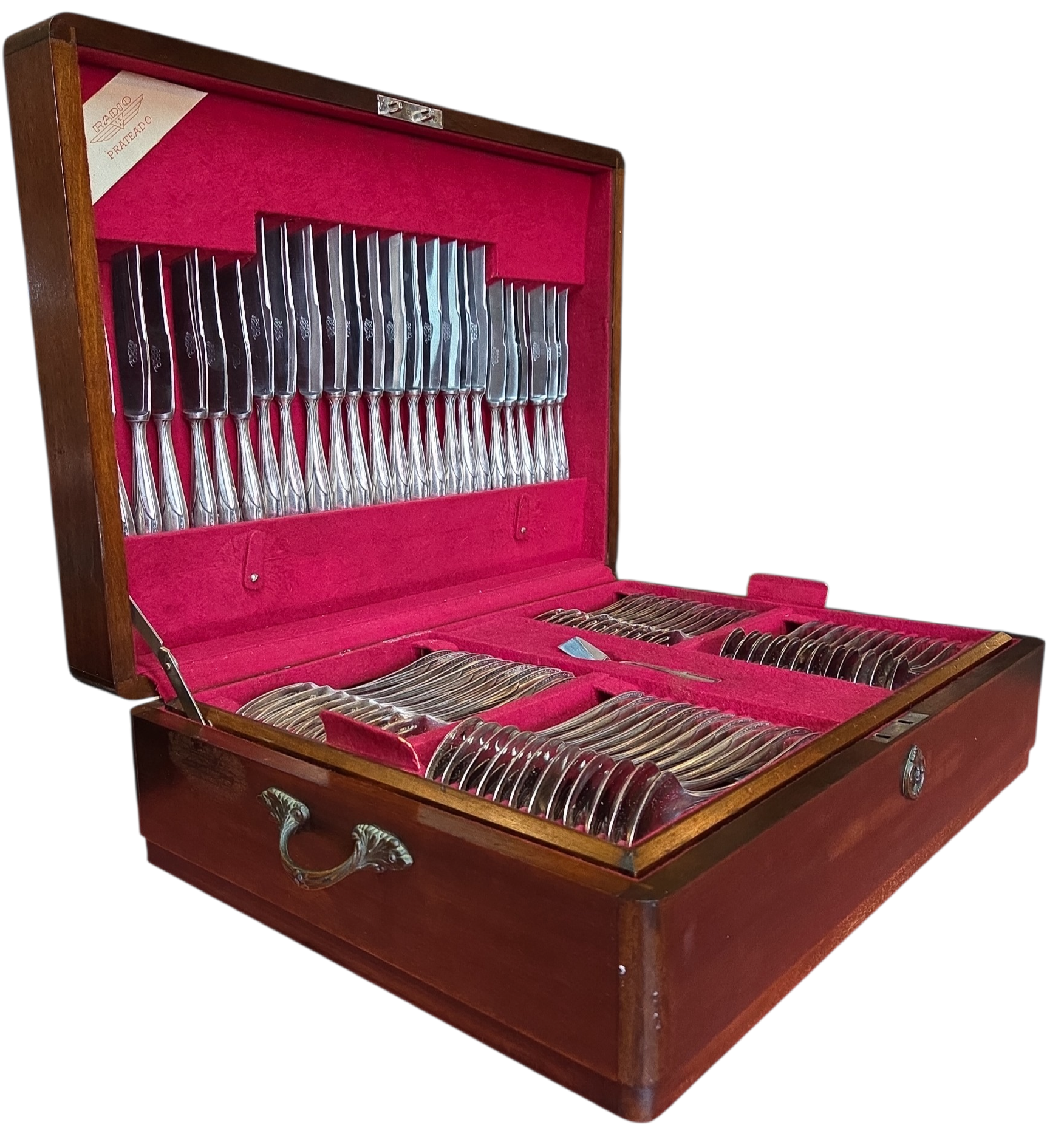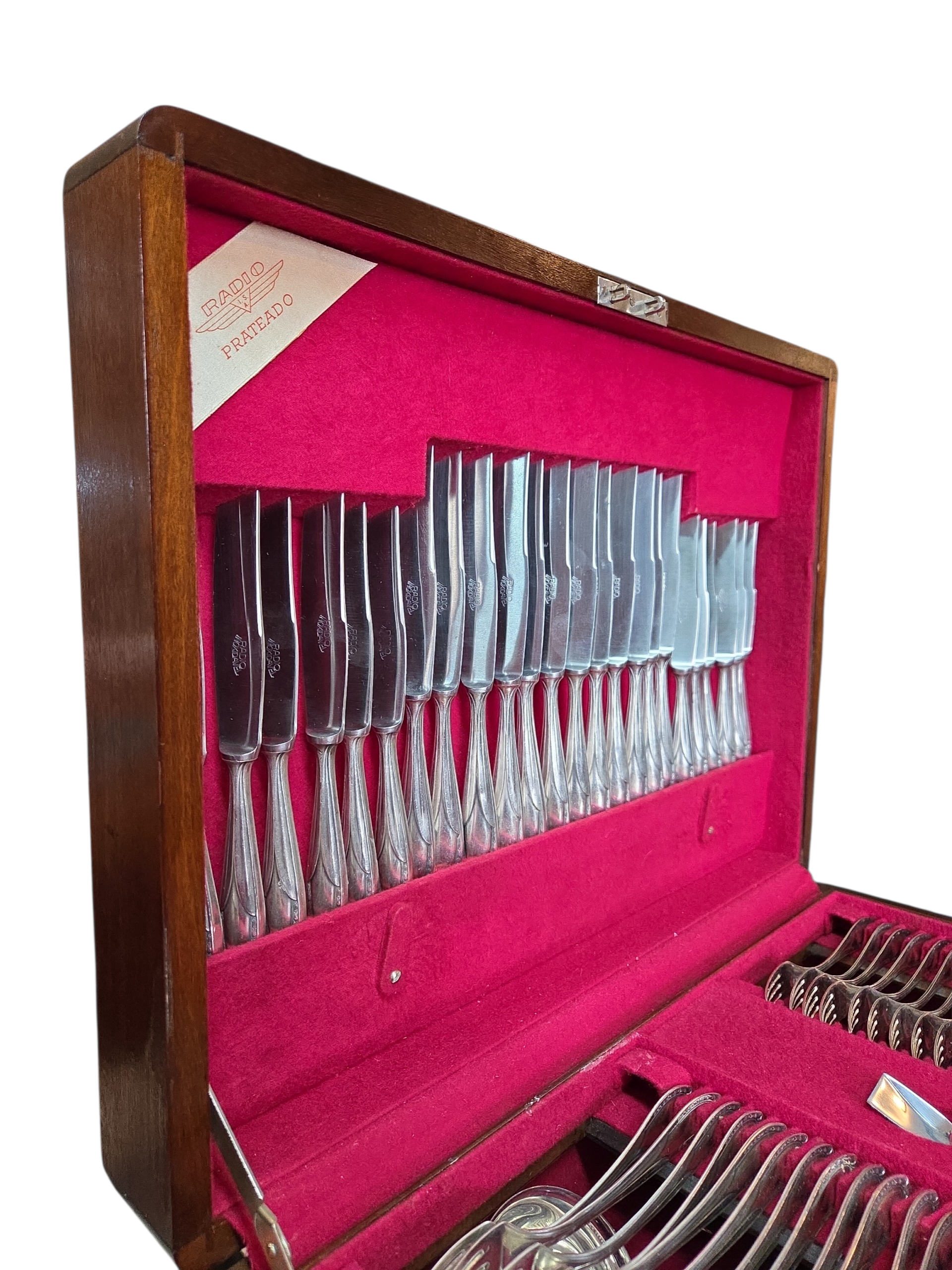 Para quem busca uma mesa posta com presença e história, este faqueiro Modelo Radio é a escolha definitiva. Com 104 peças, ele oferece o serviço completo para até 12 pessoas, garantindo que da entrada ao cafezinho, tudo esteja em perfeita harmonia.
