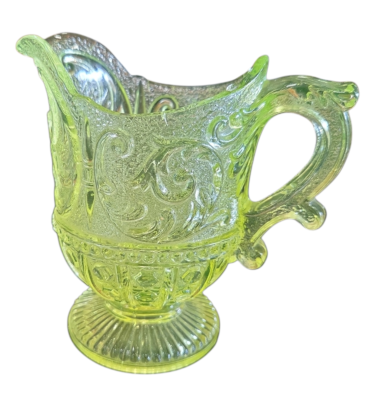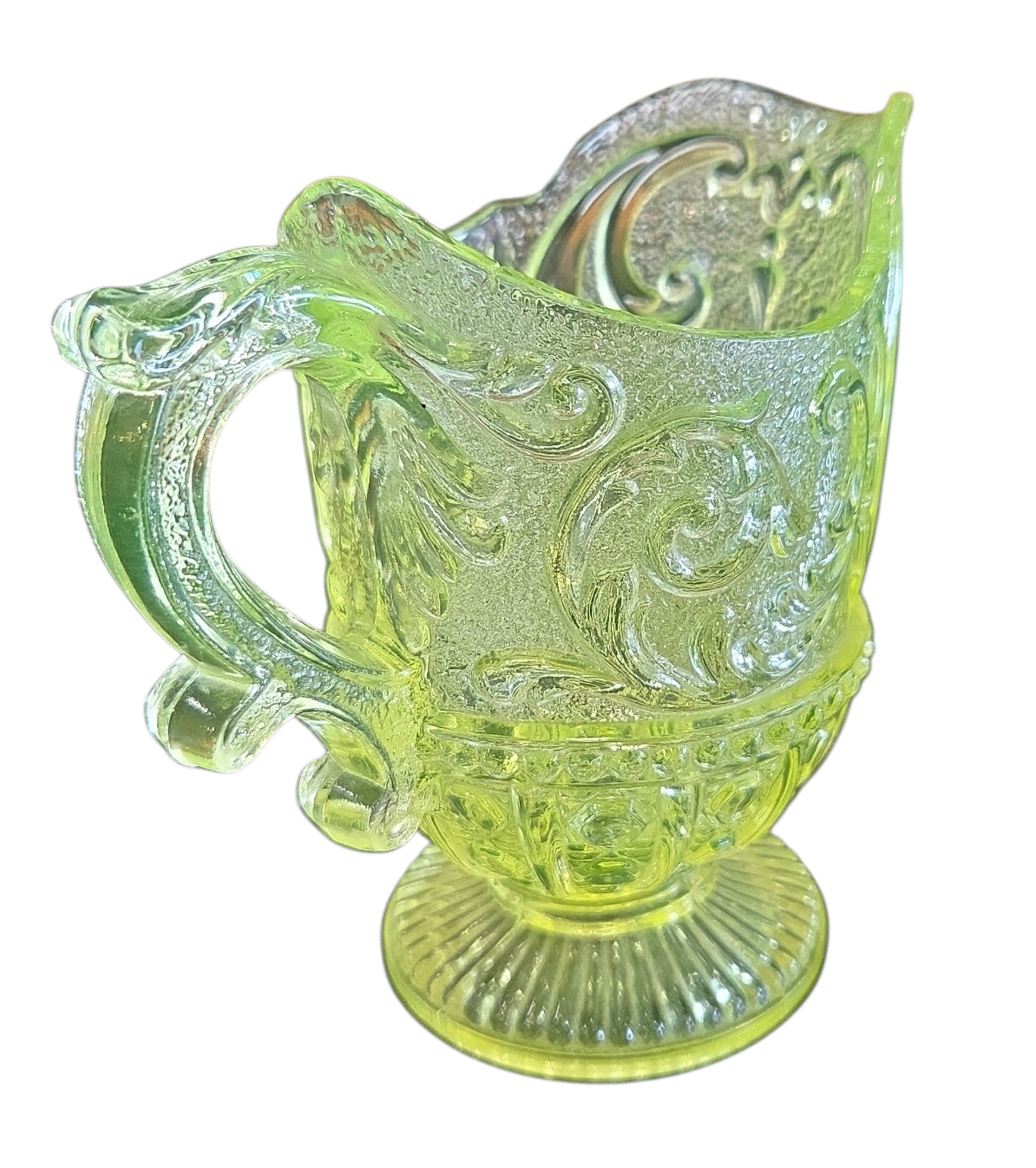 Peça indispensável para colecionadores de vidros antigos e curiosidades históricas. Esta cremeira é fabricada em Uralina (Uranium Glass), um tipo de vidro que contém óxido de urânio em sua composição, conferindo-lhe uma tonalidade amarela-esverdeada única sob luz natural.