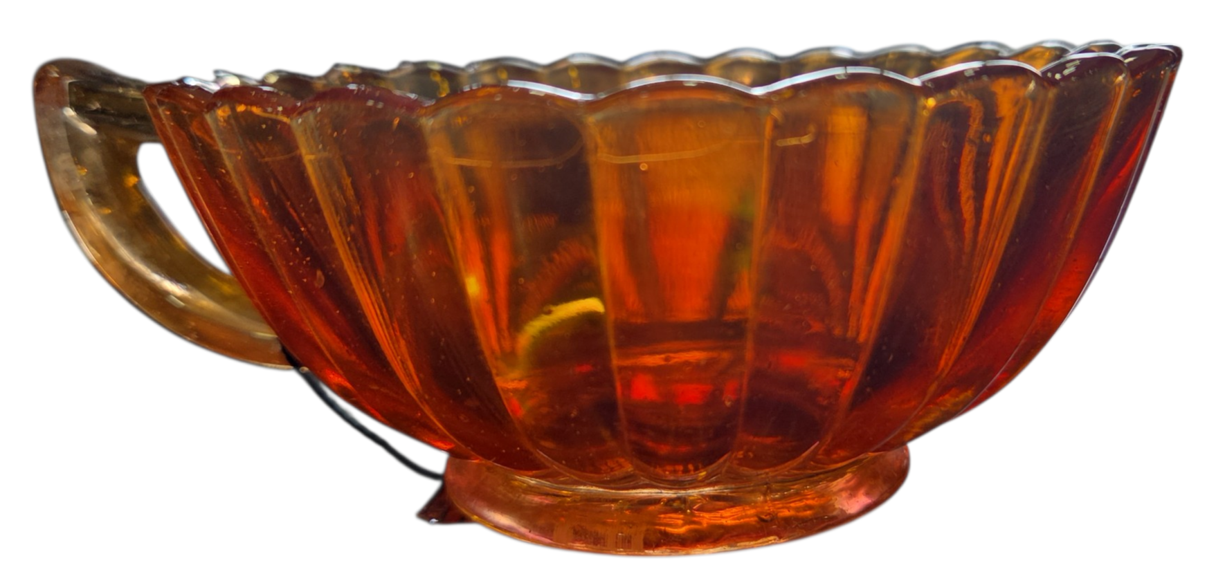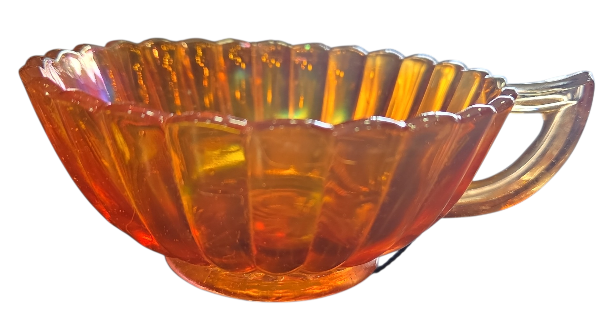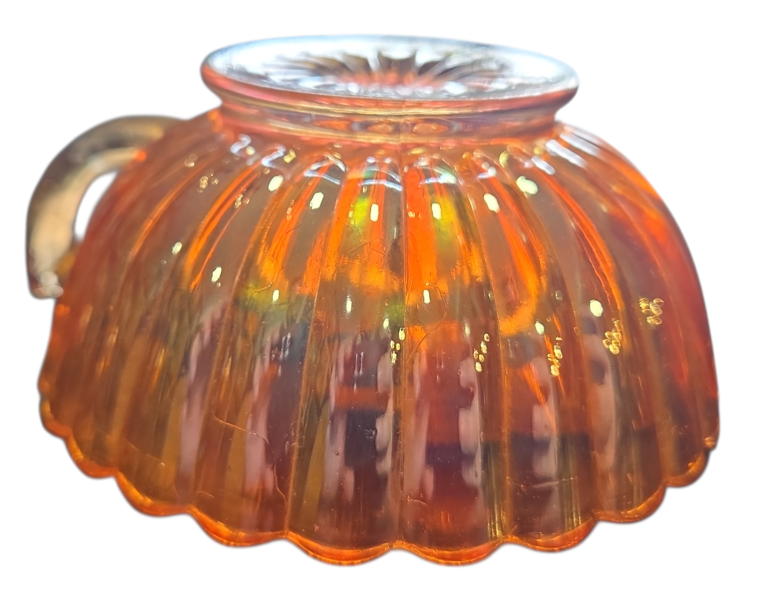 Traga o charme das feiras de antiguidade para a sua mesa. Esta xícara de Carnival Glass não é apenas um item utilitário, mas uma peça de destaque que muda de cor sob a luz, criando um efeito visual mágico e sofisticado.