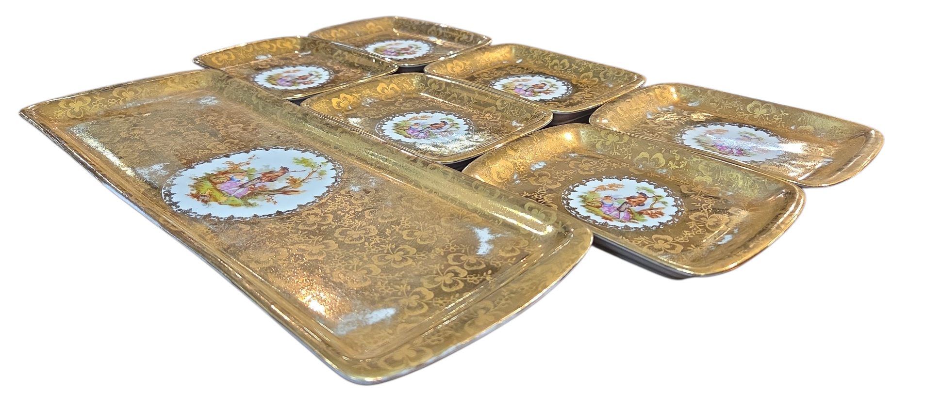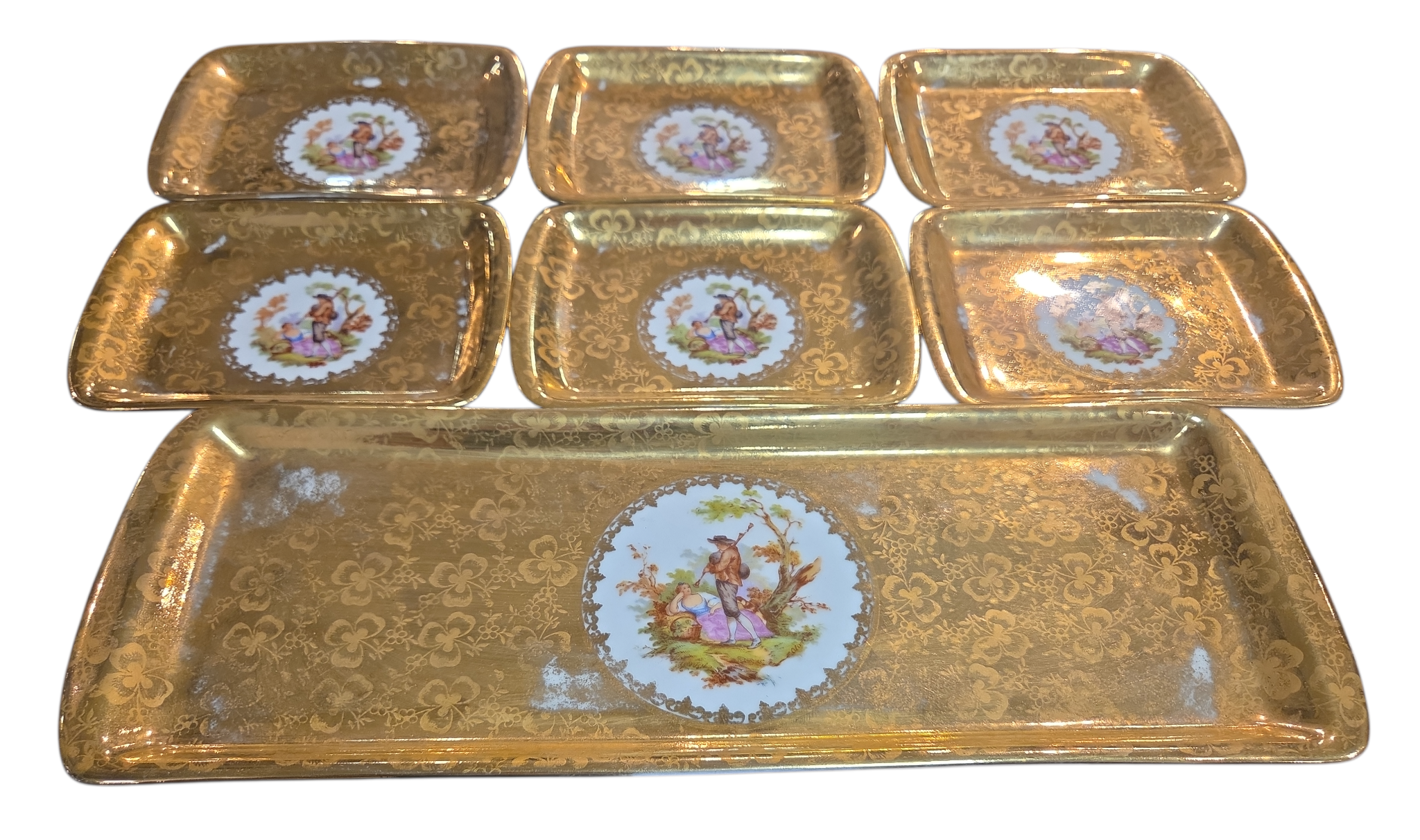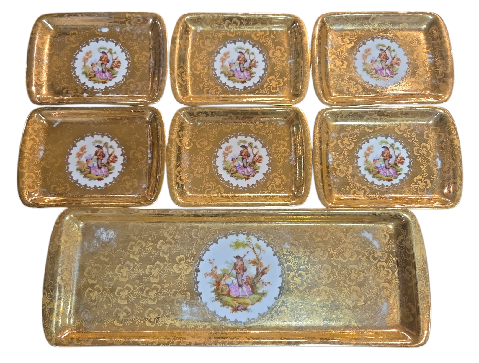 Este conjunto luxuoso da renomada Porcelana D.P. é composto por uma travessa retangular e seis pequenos pratos (ideais para canapés, doces finos ou como pires de luxo). As peças apresentam um deslumbrante acabamento em banho de ouro com textura floral e, ao centro, uma clássica pintura de cena galante — representando o romantismo bucólico francês.