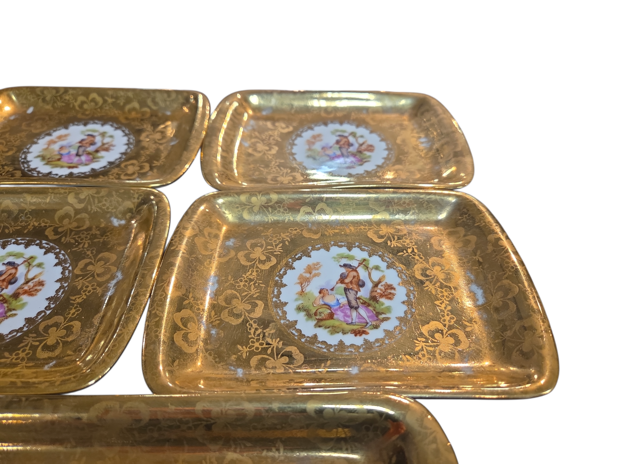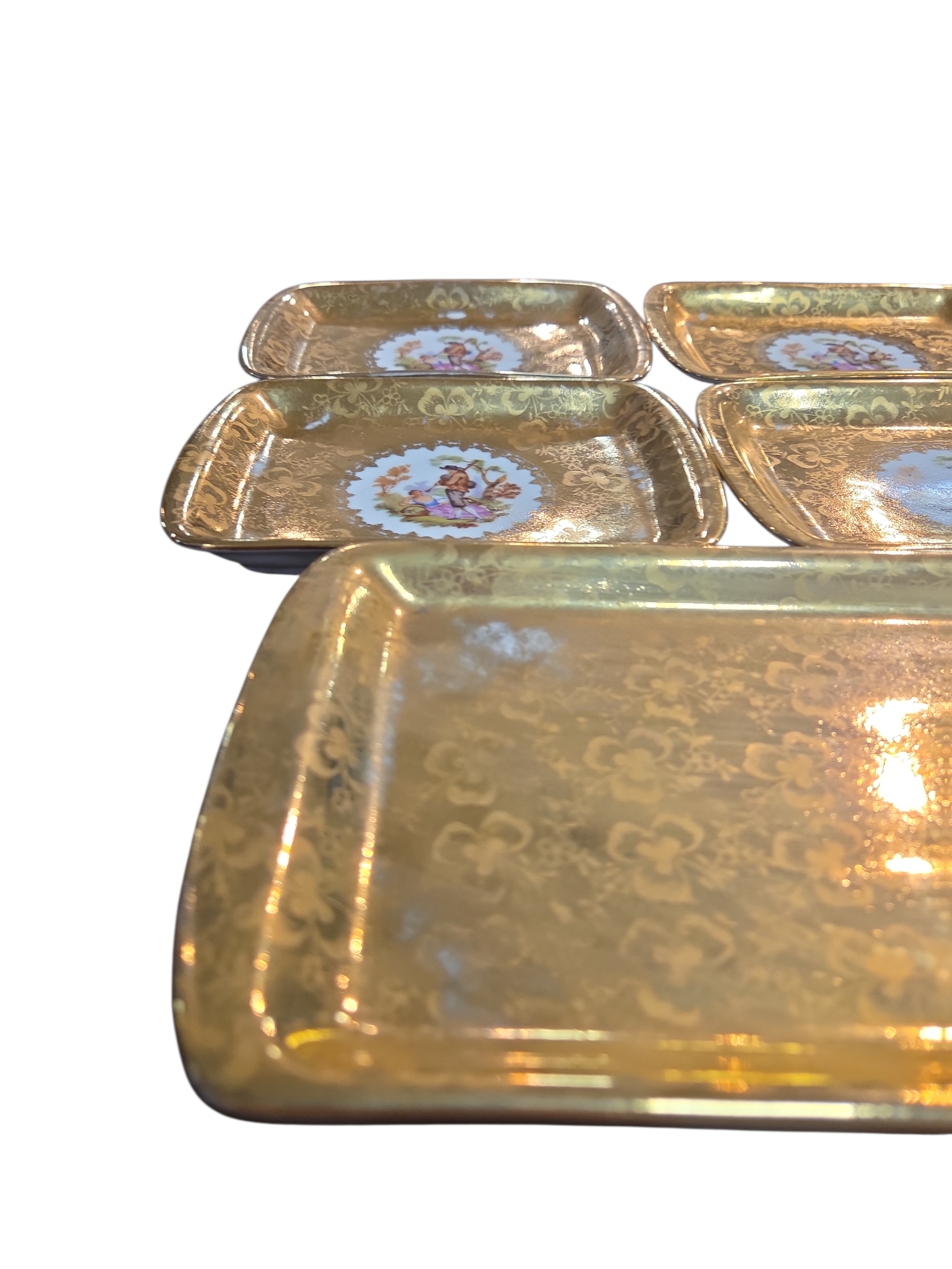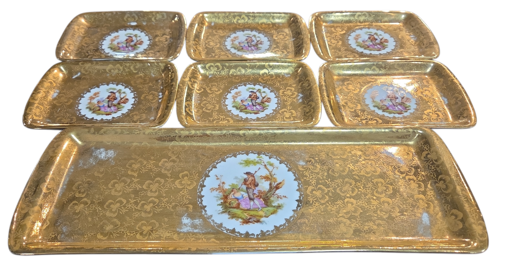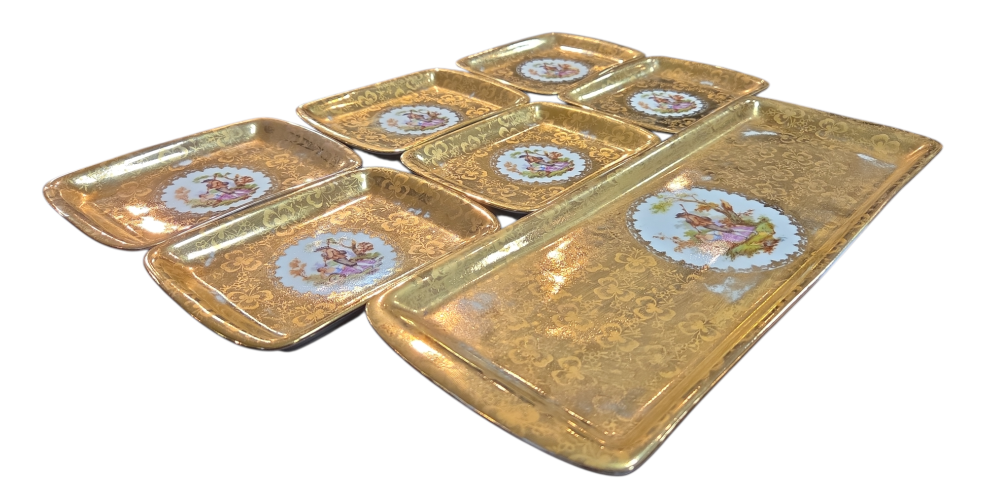 Este conjunto luxuoso da renomada Porcelana D.P. é composto por uma travessa retangular e seis pequenos pratos (ideais para canapés, doces finos ou como pires de luxo). As peças apresentam um deslumbrante acabamento em banho de ouro com textura floral e, ao centro, uma clássica pintura de cena galante — representando o romantismo bucólico francês.