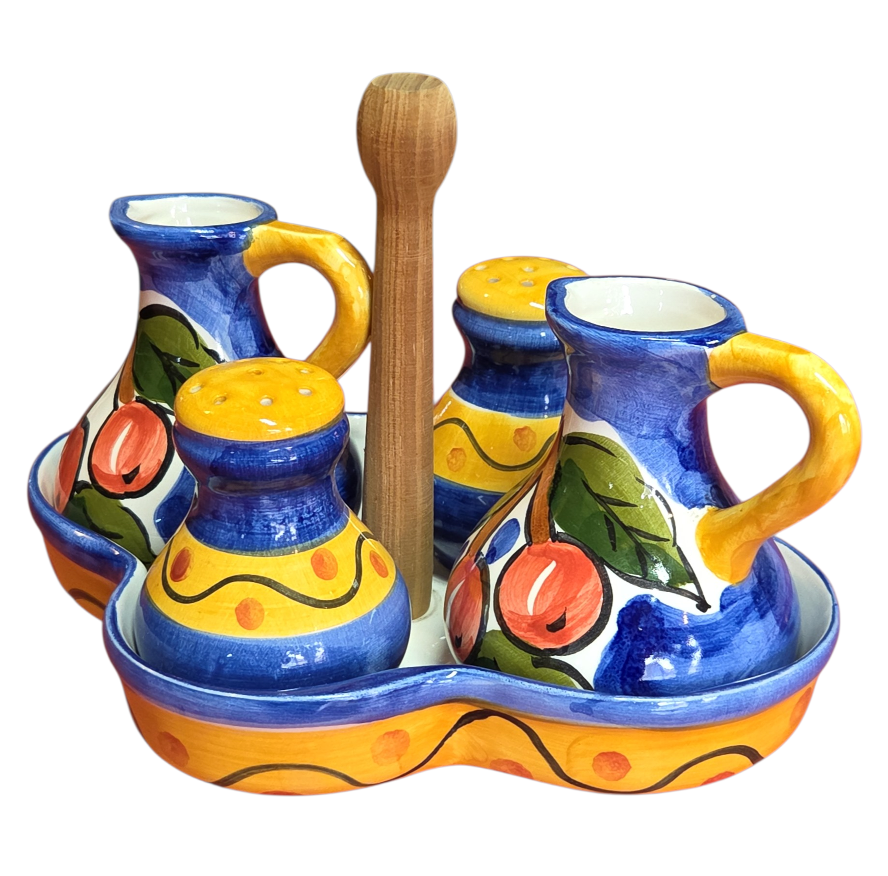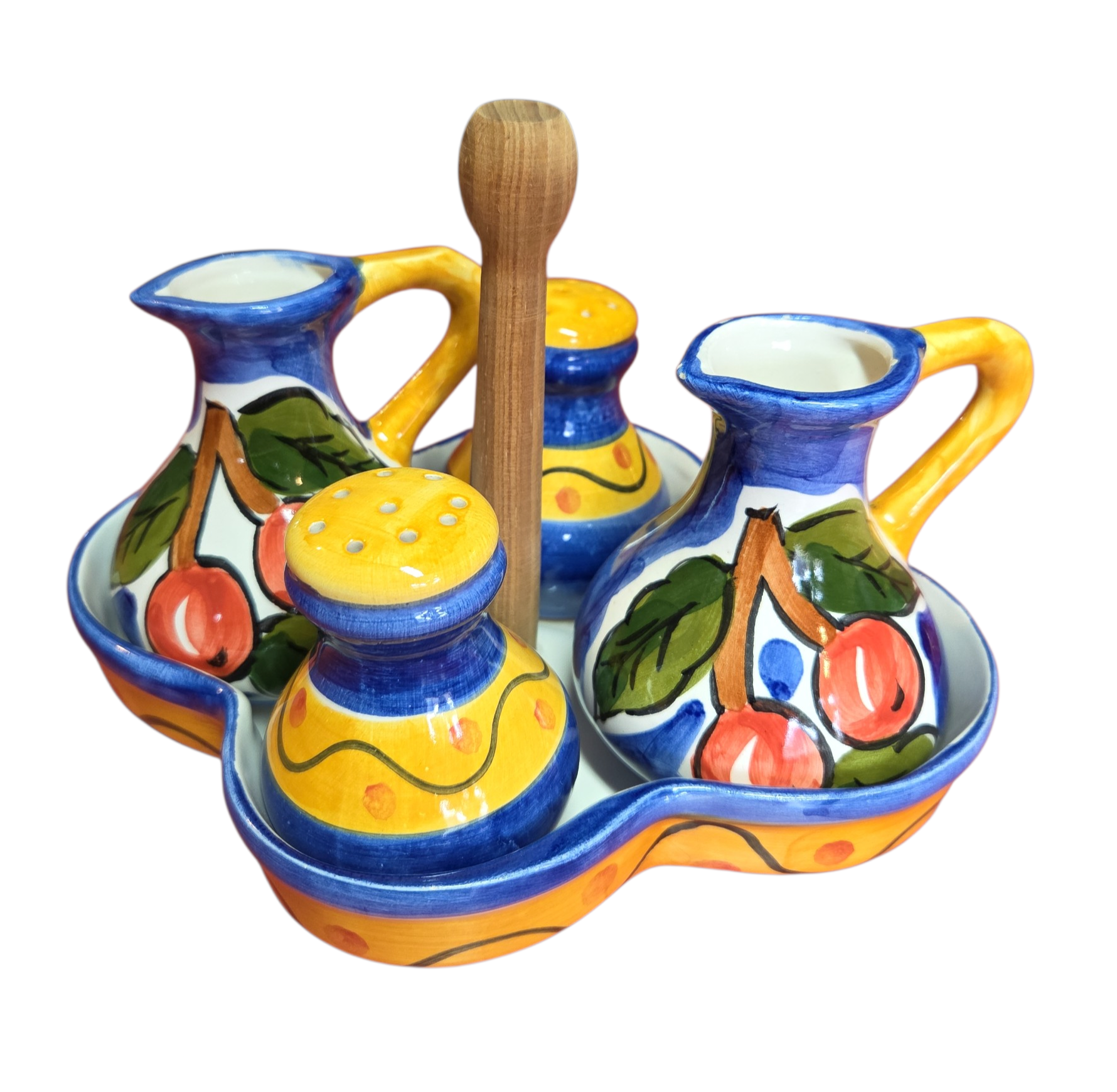 Adicione charme e cor à sua mesa com este lindo galheteiro em cerâmica pintada à mão. Com um design orgânico e cores vibrantes, este conjunto é perfeito tanto para o uso diário quanto para decorar espaços gourmet e cozinhas rústicas. O destaque fica para a pintura artesanal de cerejas, que remete ao frescor do campo.