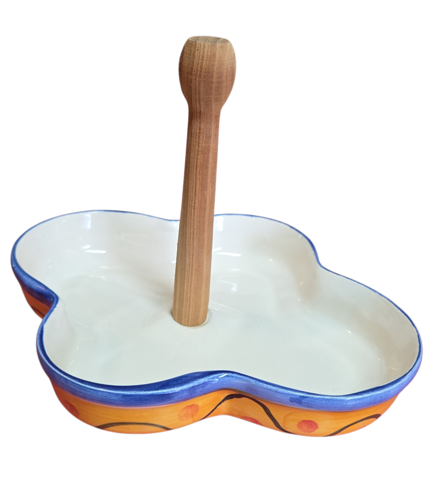 01 Suporte (Base): Travessa com formato ondulado que acomoda perfeitamente as 4 peças, equipada com uma haste central de madeira para transporte seguro e prático.