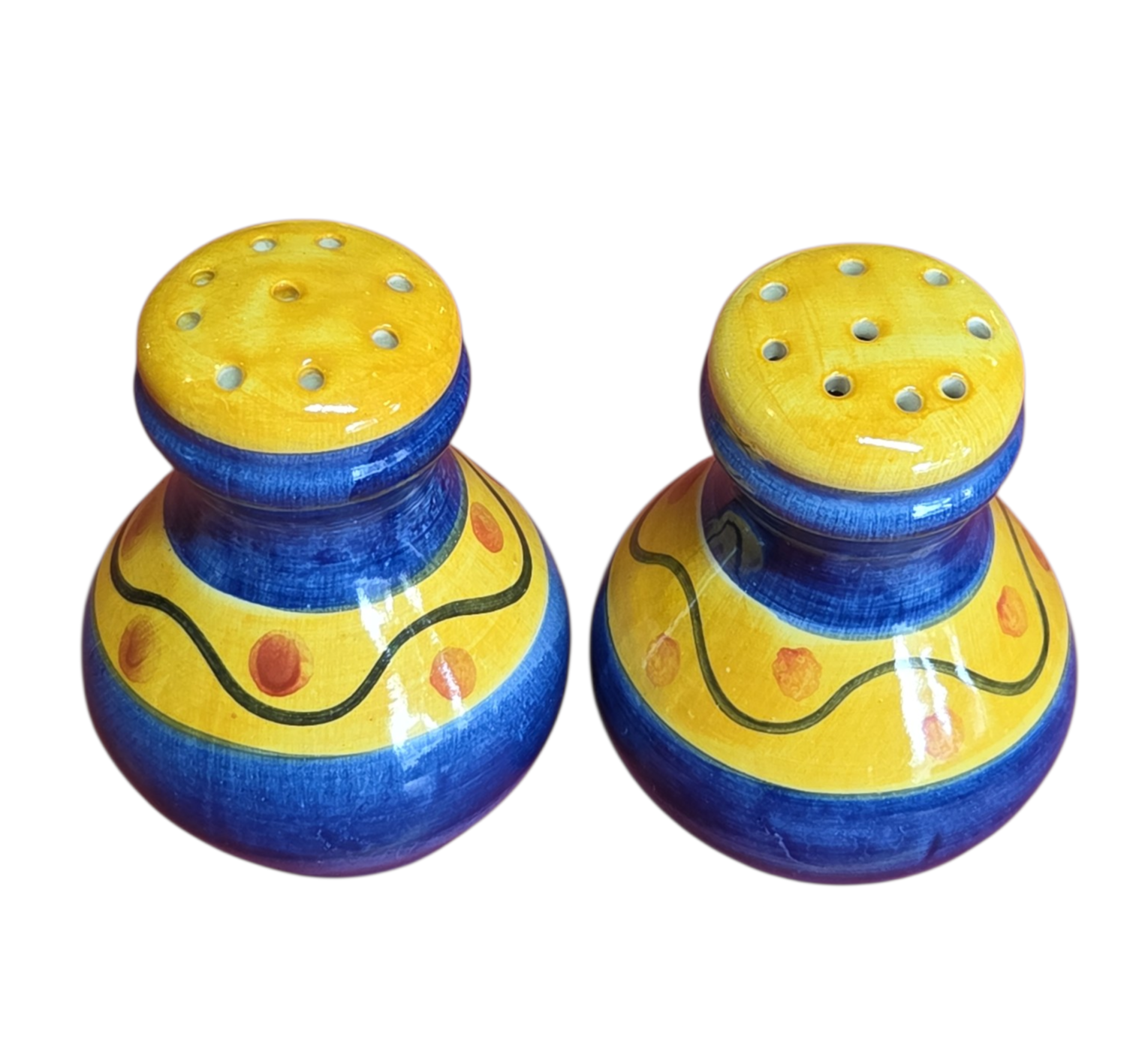 01 Saleiro: Com furação superior e design bojudo, decorado em tons de amarelo e azul.