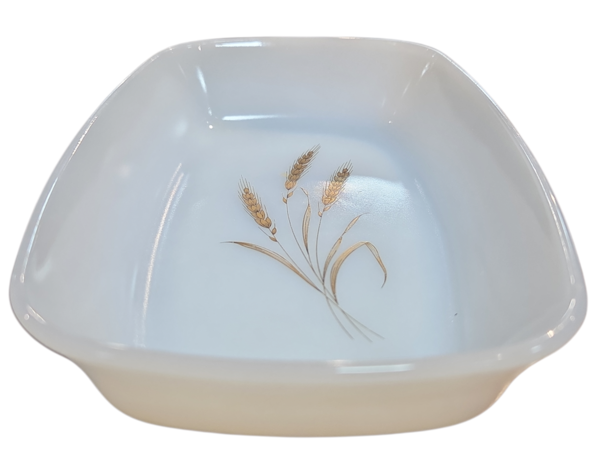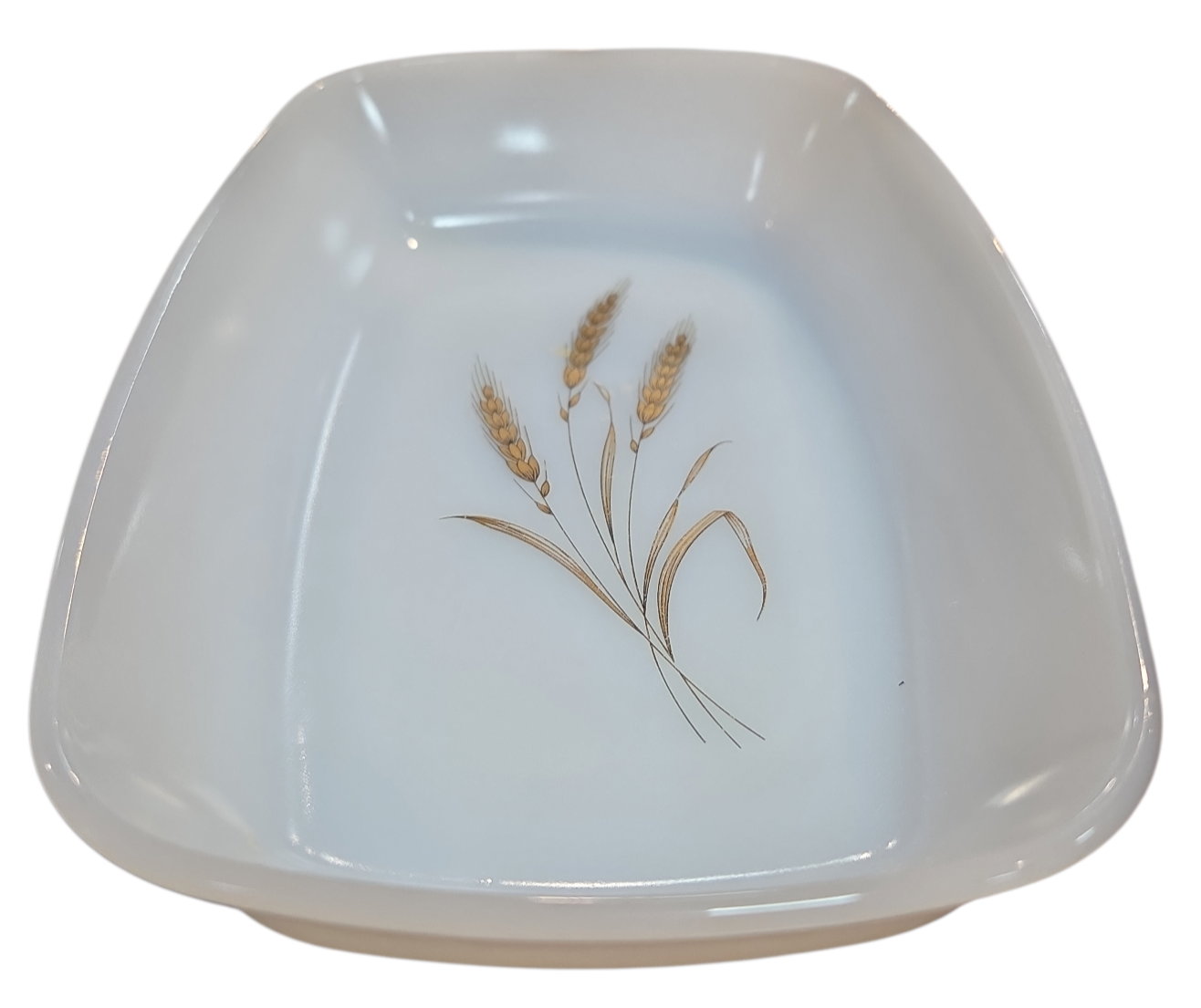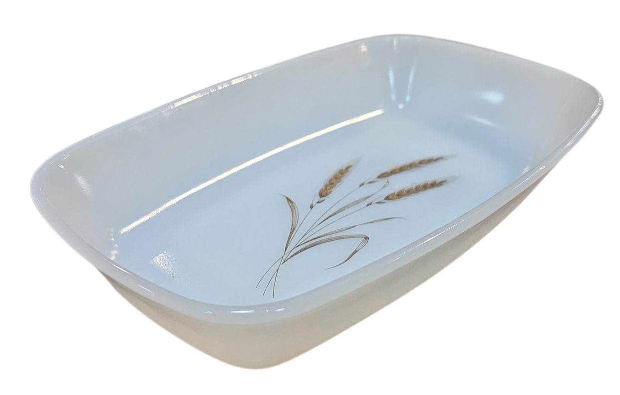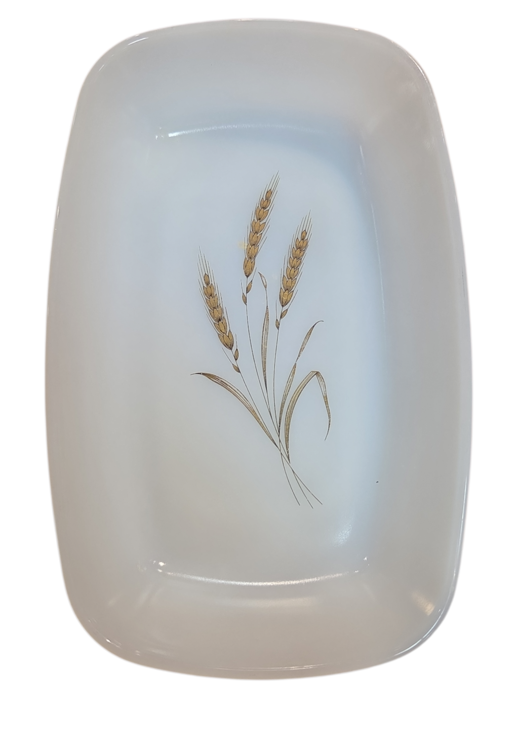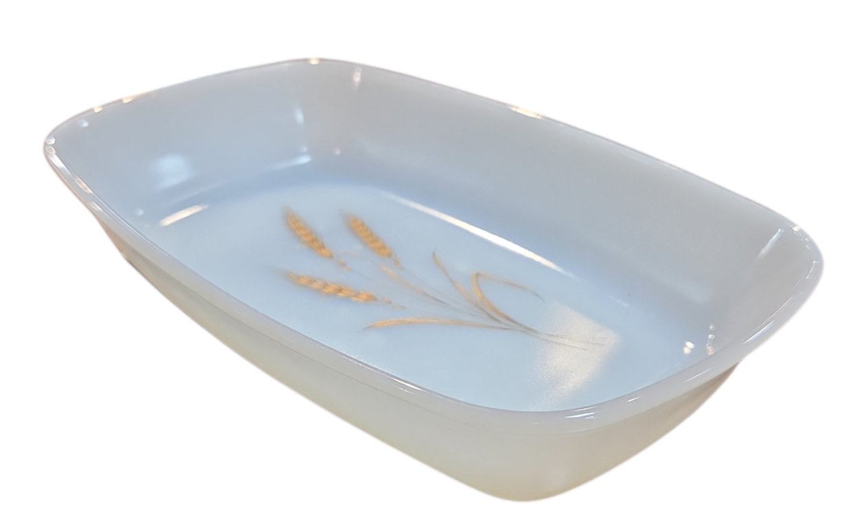Esta assadeira em vidro opaline (leitoso) da renomada marca francesa Arcopal é um item indispensável para quem ama o estilo farmhouse ou coleciona peças vintage de alta qualidade. Com o icônico padrão de espigas de trigo em tons de dourado e marrom, ela une funcionalidade e elegância rústica.