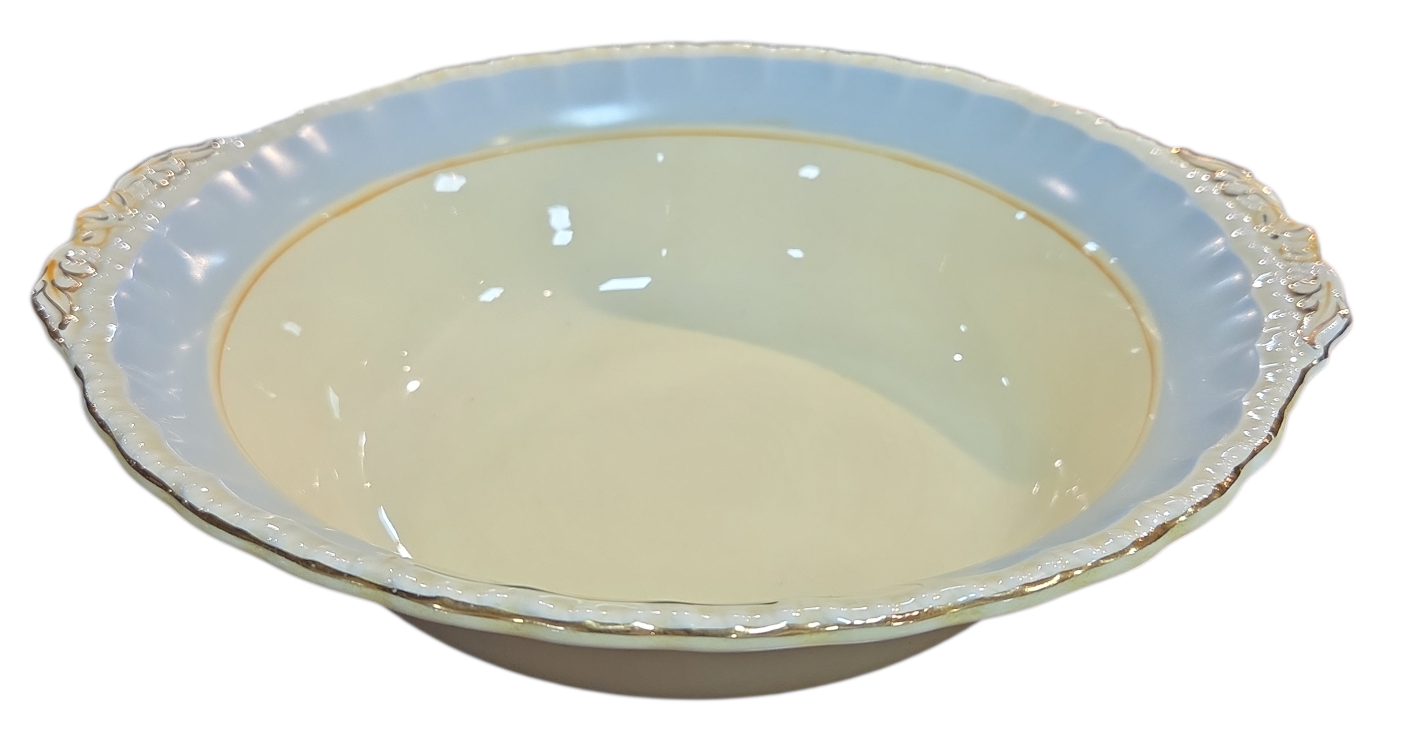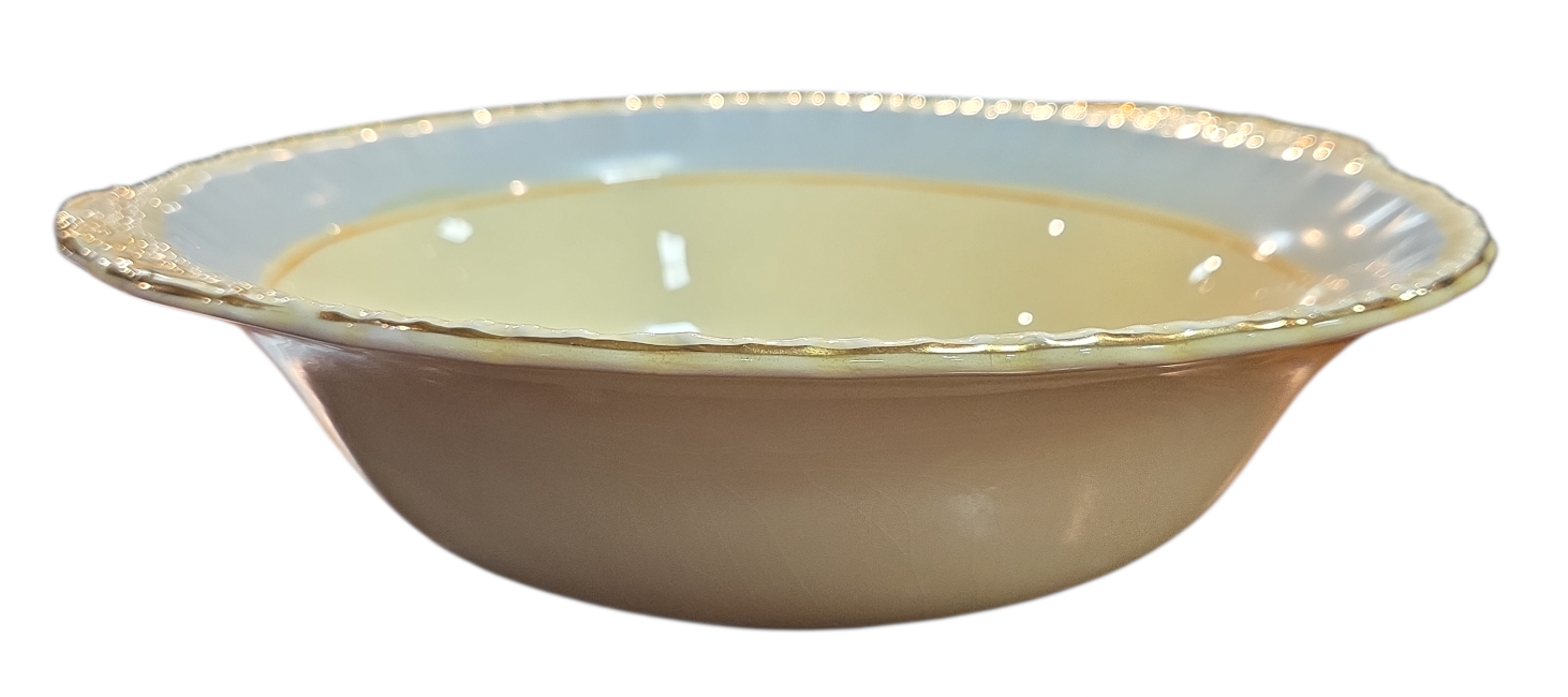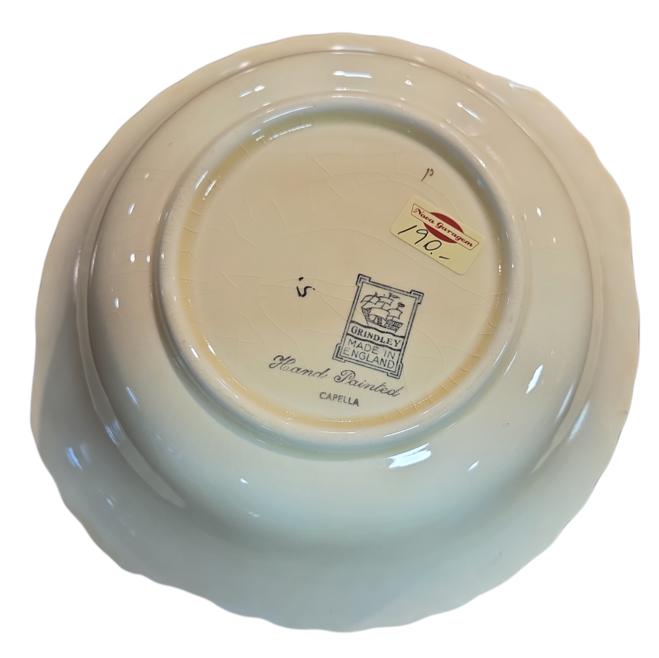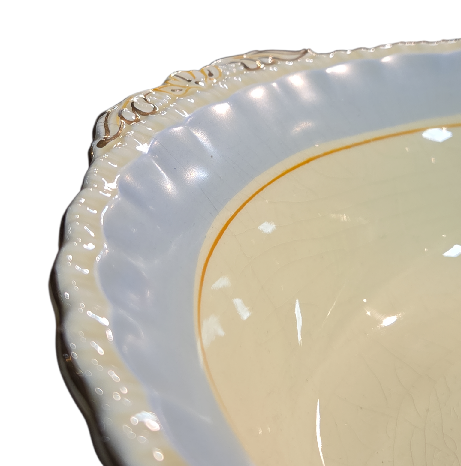 Linda travessa funda em faiança fina (ironstone), fabricada pela renomada marca Grindley, na Inglaterra. Modelo "Capella", com acabamento de bordas onduladas e detalhes em relevo nas alças.