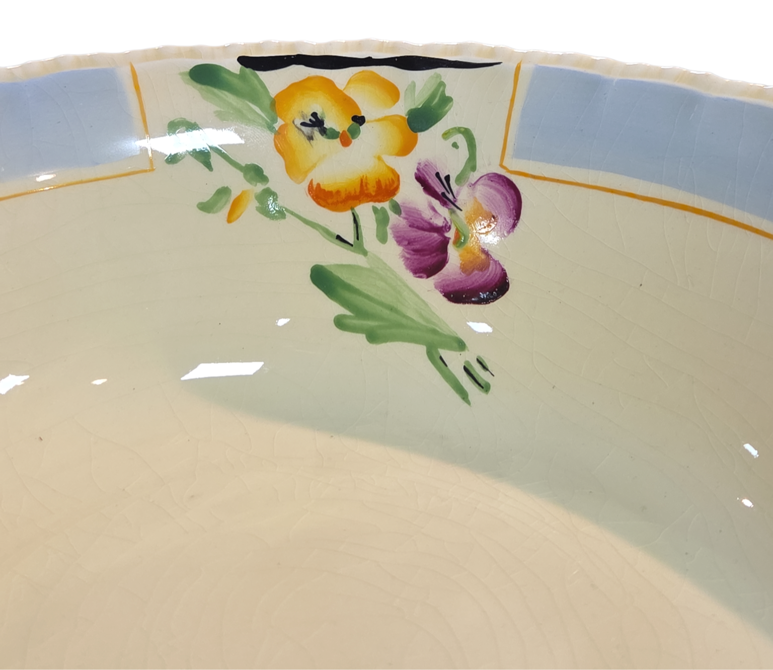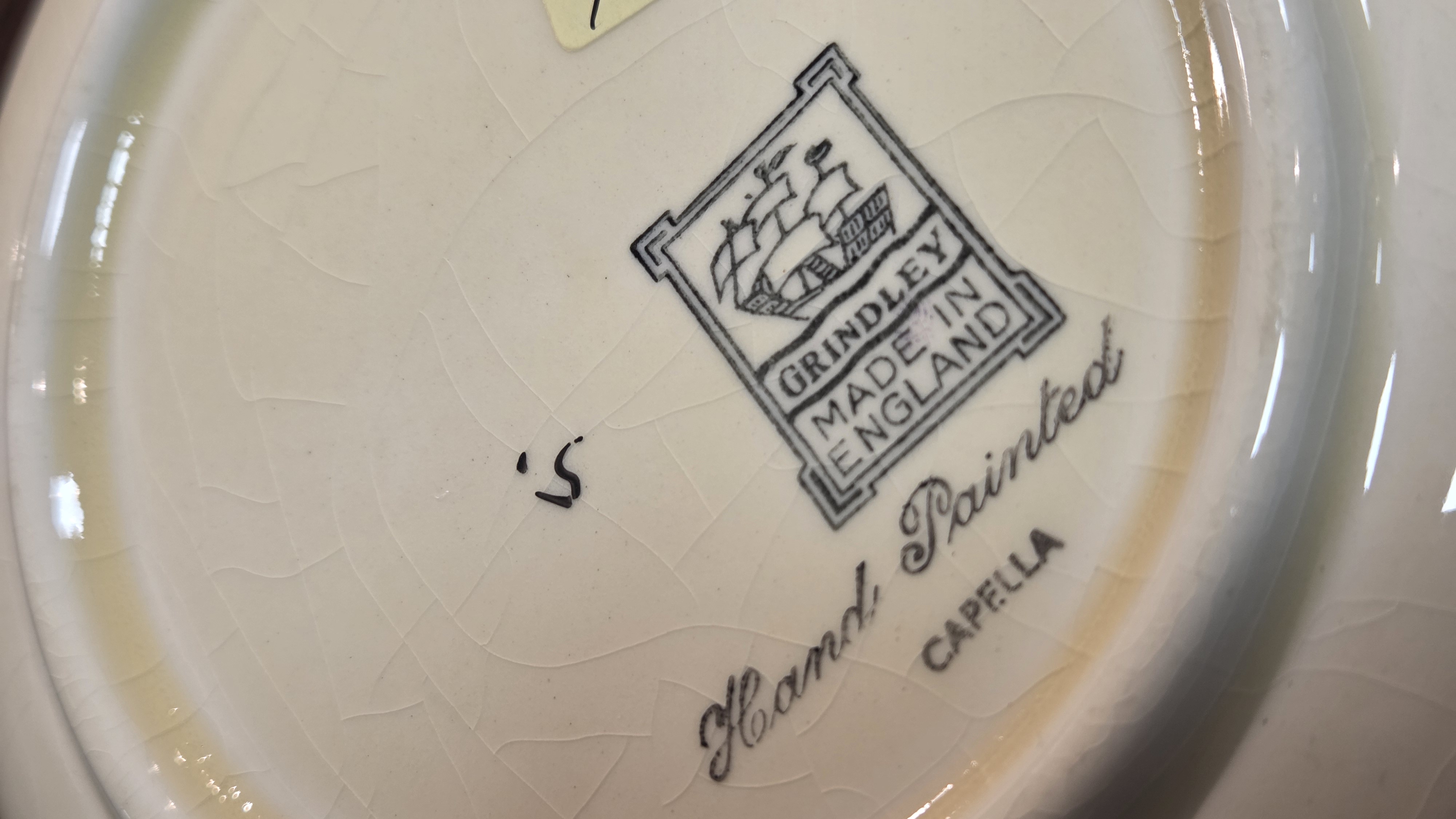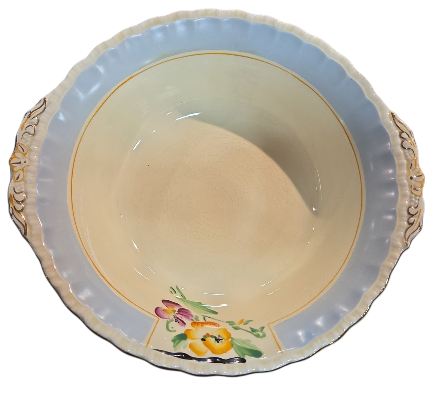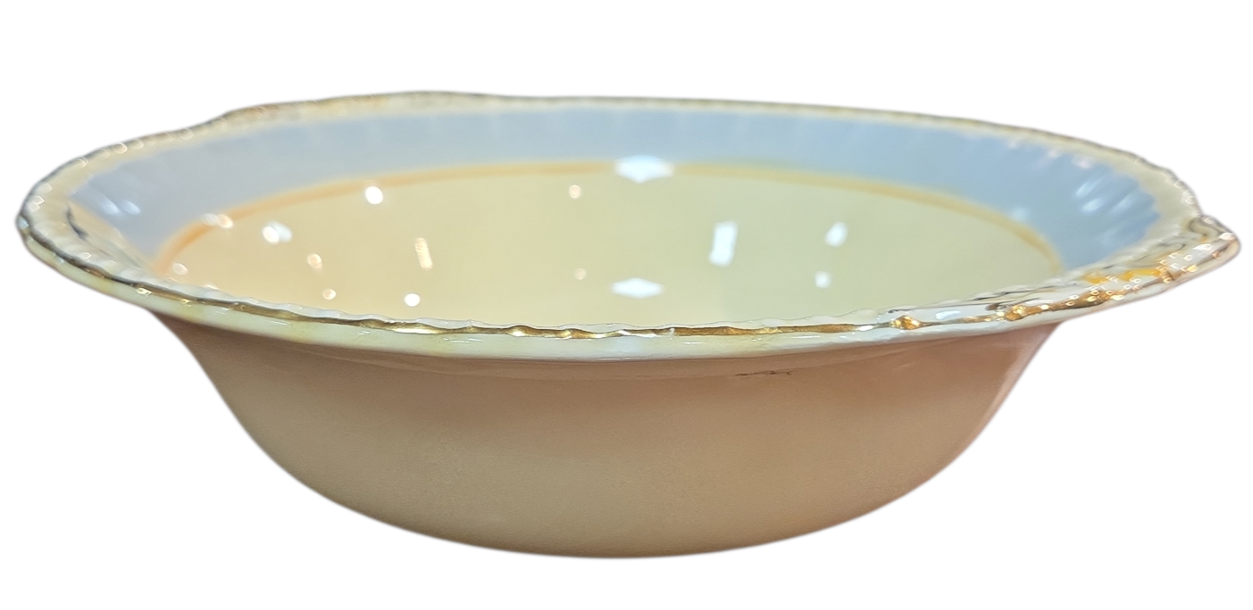 Linda travessa funda em faiança fina (ironstone), fabricada pela renomada marca Grindley, na Inglaterra. Modelo "Capella", com acabamento de bordas onduladas e detalhes em relevo nas alças.
